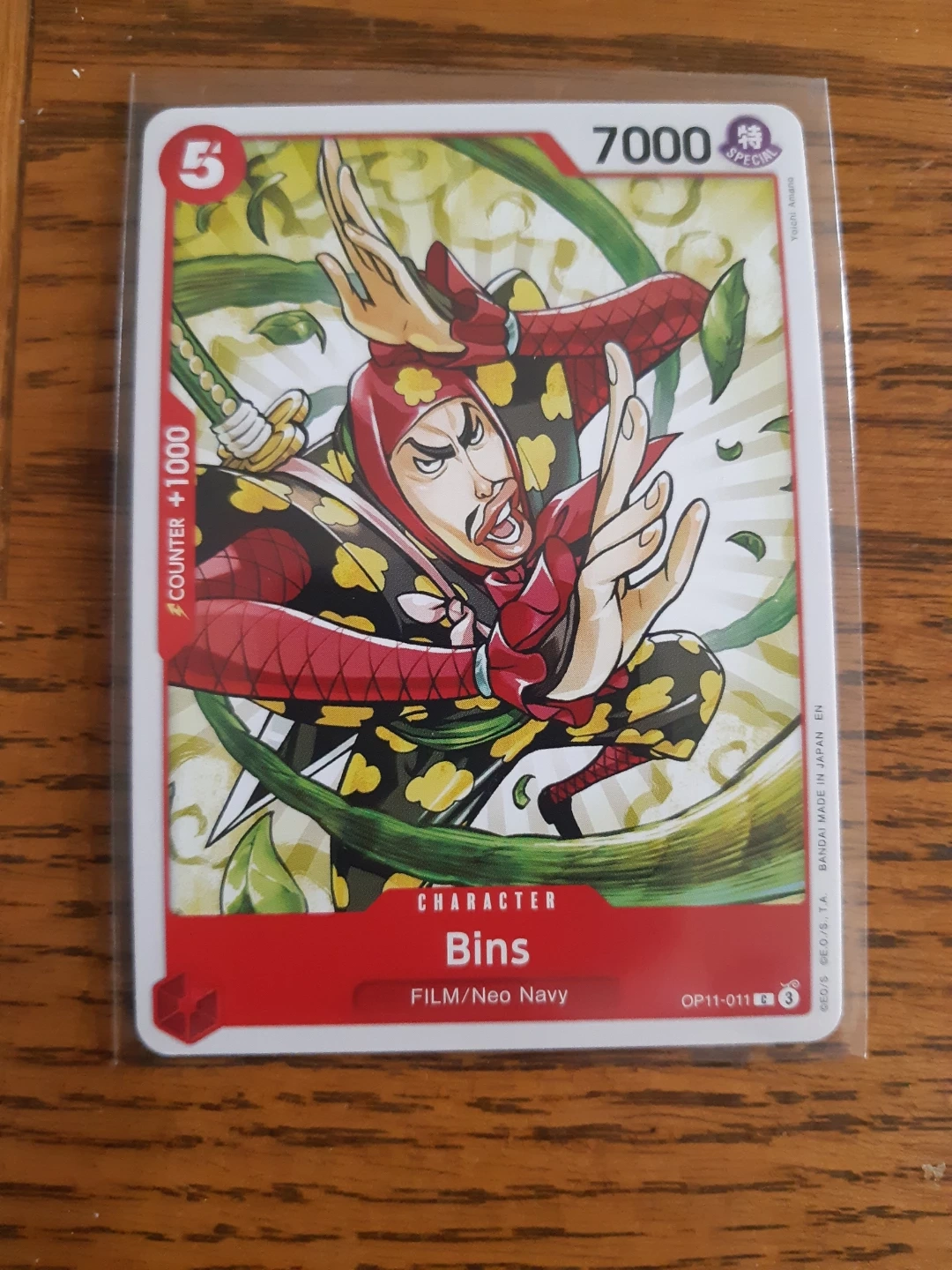 Selling a One Piece Card Game card featuring the character Bins. The card is marked OP11-011 and is from the FILM/Neo Navy set. It has a power of 7000 and a counter of +1000.