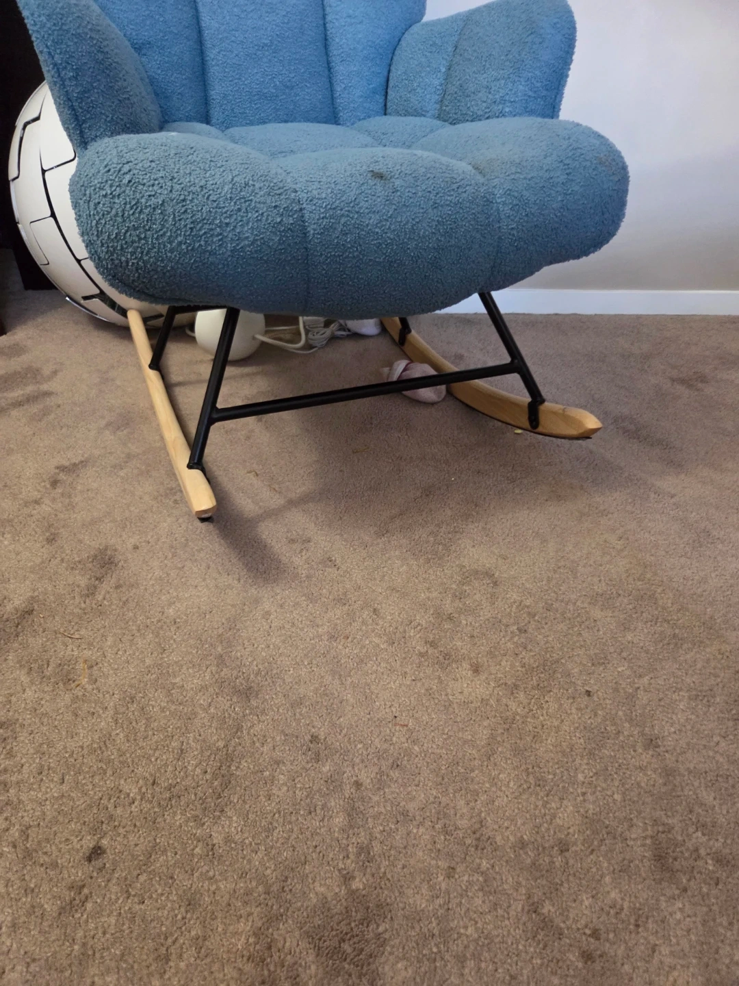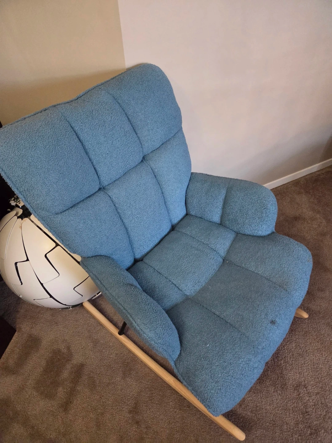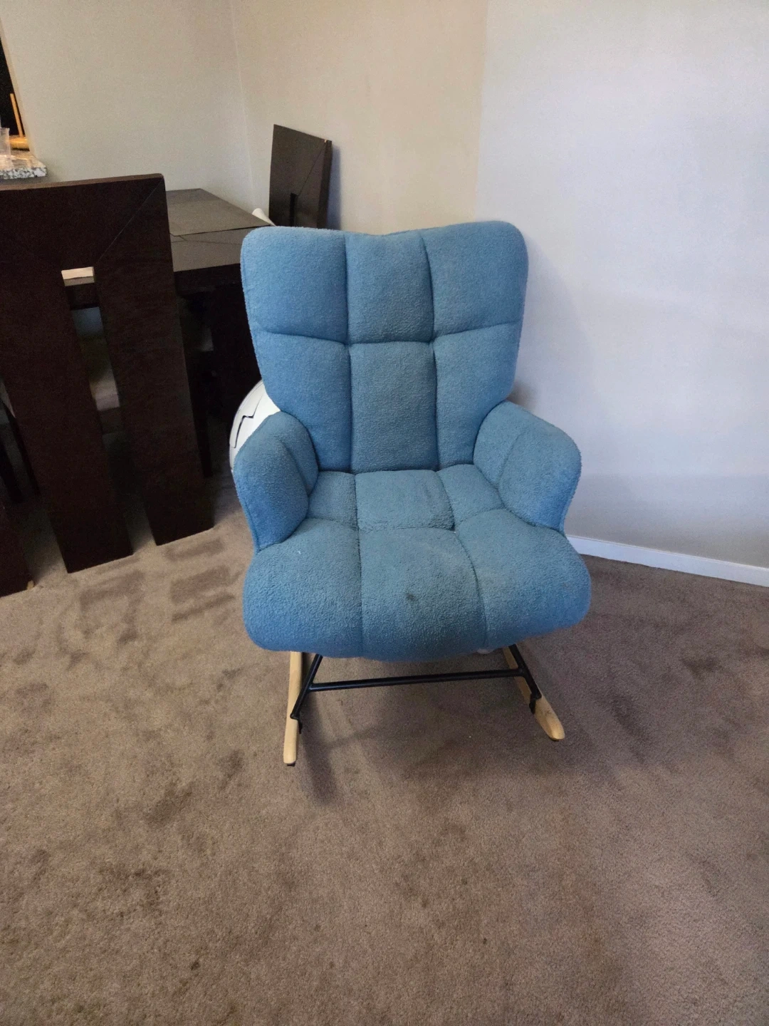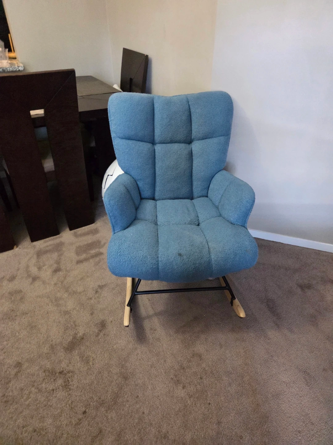 Selling a comfy blue rocking chair! It's in good condition and would be perfect for a nursery or living room. It has a few minor spots, but overall it's a great chair for relaxing