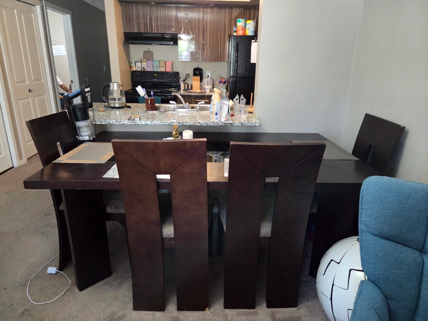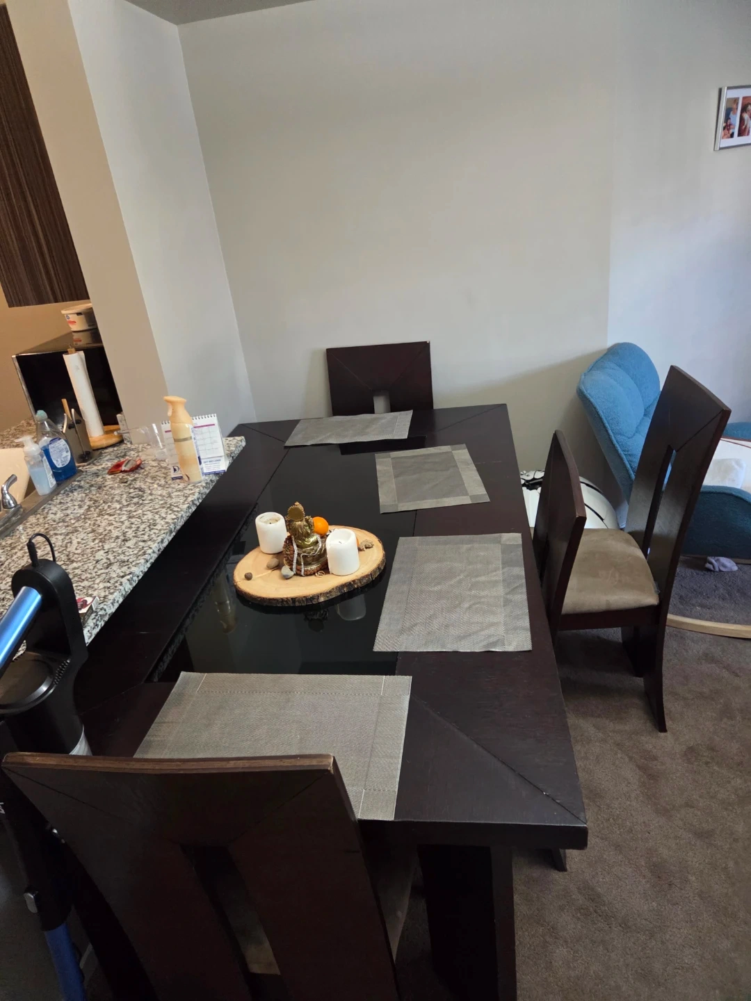 Dining table with four chairs available. It has a dark brown finish. There are some signs of use. But an exceptionally rare find. I bought it for 2000 brand new so I have lowered it quit a lot. It is as heavy as it looks so please if you need us to deliver let us know . Depending on the areas going fron A to B we charge 25 to 50 varying on price of gas qnd mileage.