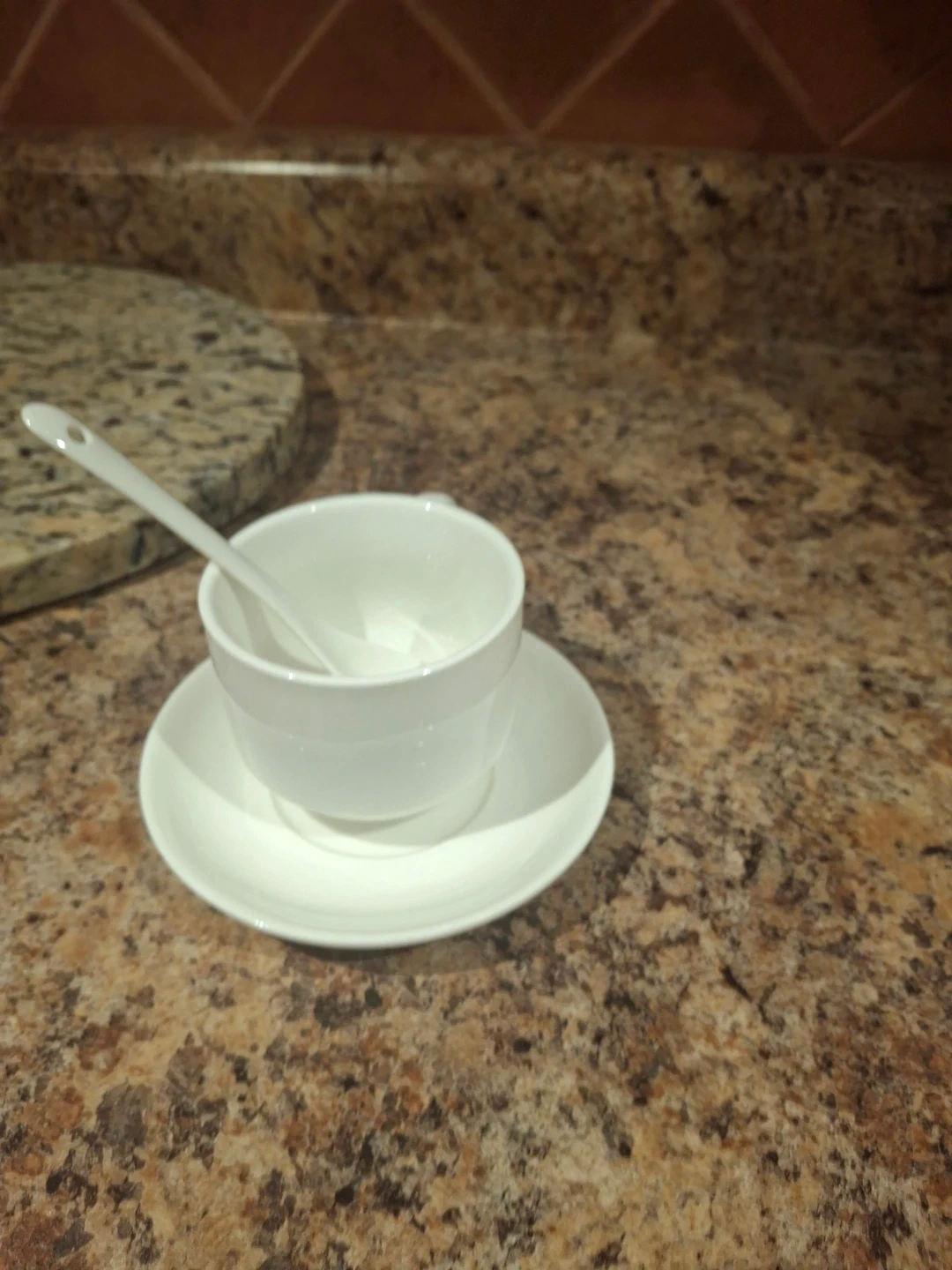 Selling a set of white tea cups and saucers. Perfect for enjoying a relaxing cup of tea or coffee with spoon
