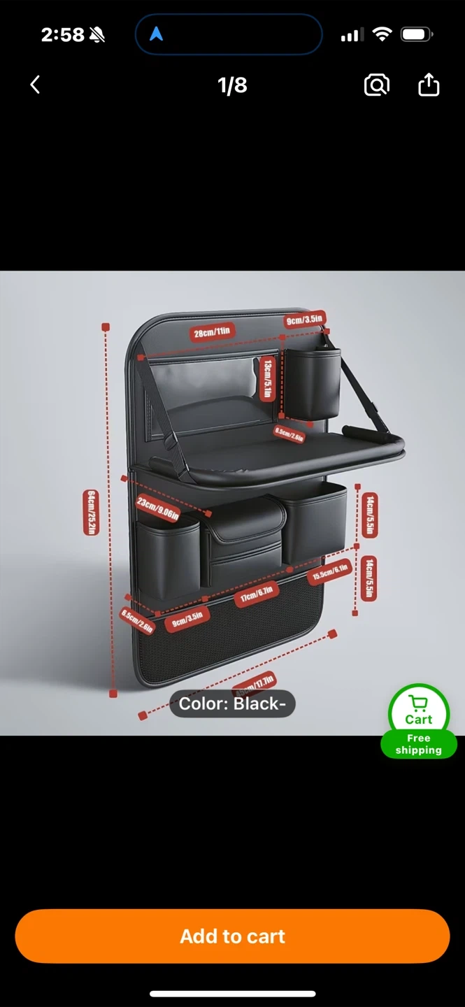 Keep your car tidy with this handy black back seat organizer! It features multiple pockets and compartments to store all your essentials. The dimensions are approximately 64cm/25.2in in height and 28cm/11in in width.