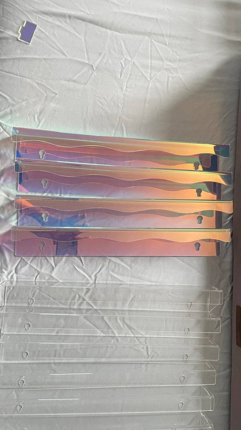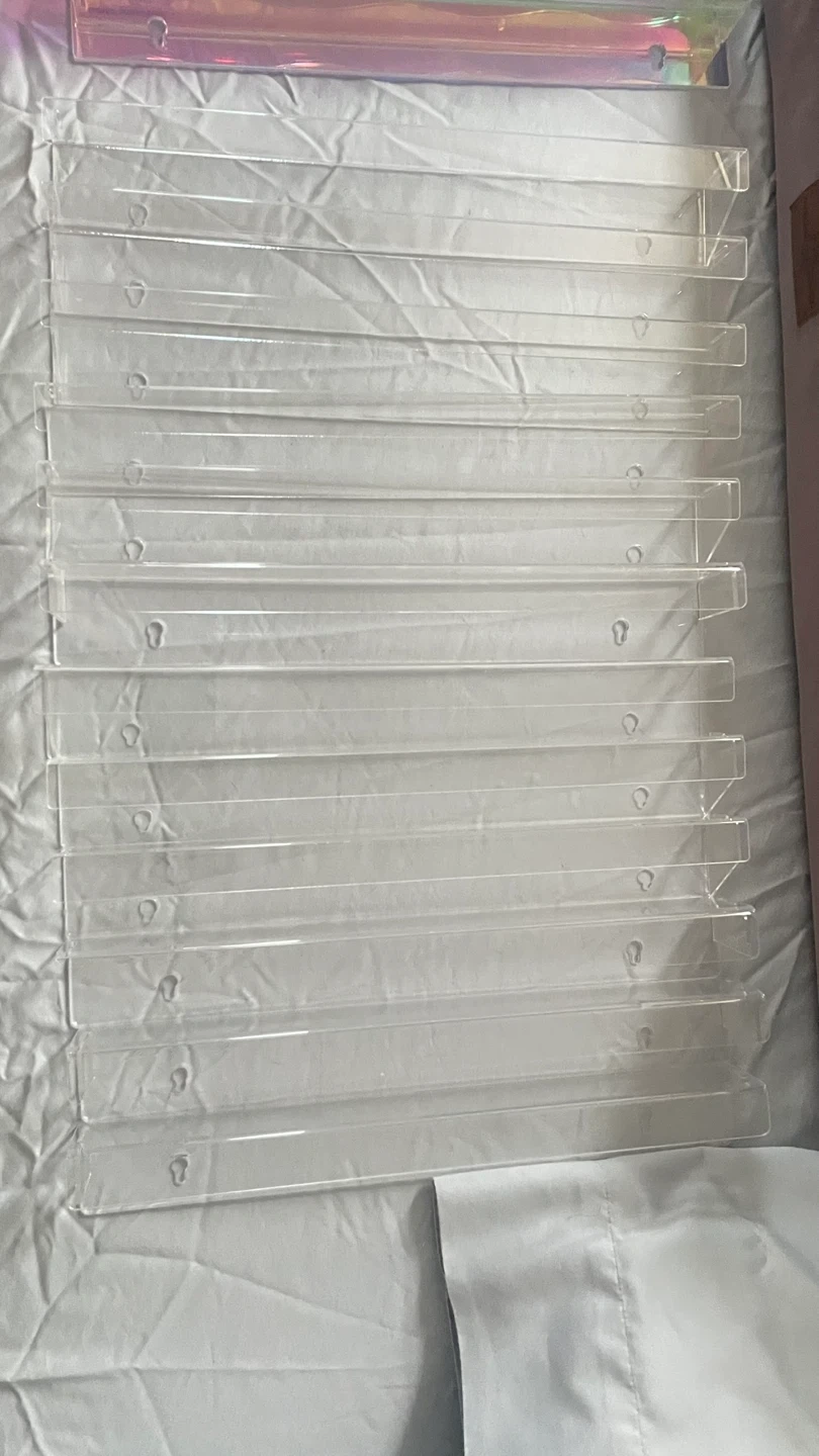 Selling a set of acrylic display shelves! These are perfect for showcasing your favorite items or organizing your space. They are clear and easy to install i used it for my nail polish but it can be multi use they are really like new just a little dusty