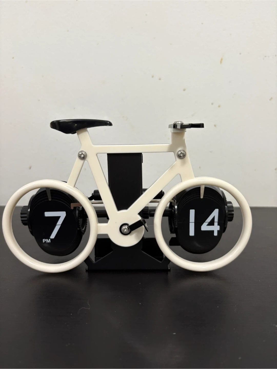 Brand new unique flip clock shaped like a bicycle. Multiple sets are available! Just ask! Comes in complete package and FREE battery. Features black and white color scheme. Shows hours and minutes. Novelty desk accessory. Great for gift giving and fashion decor.