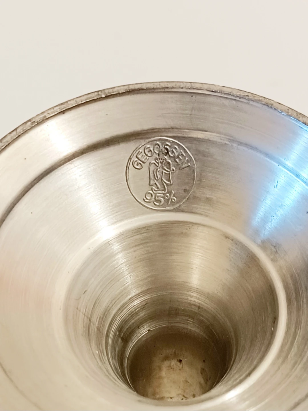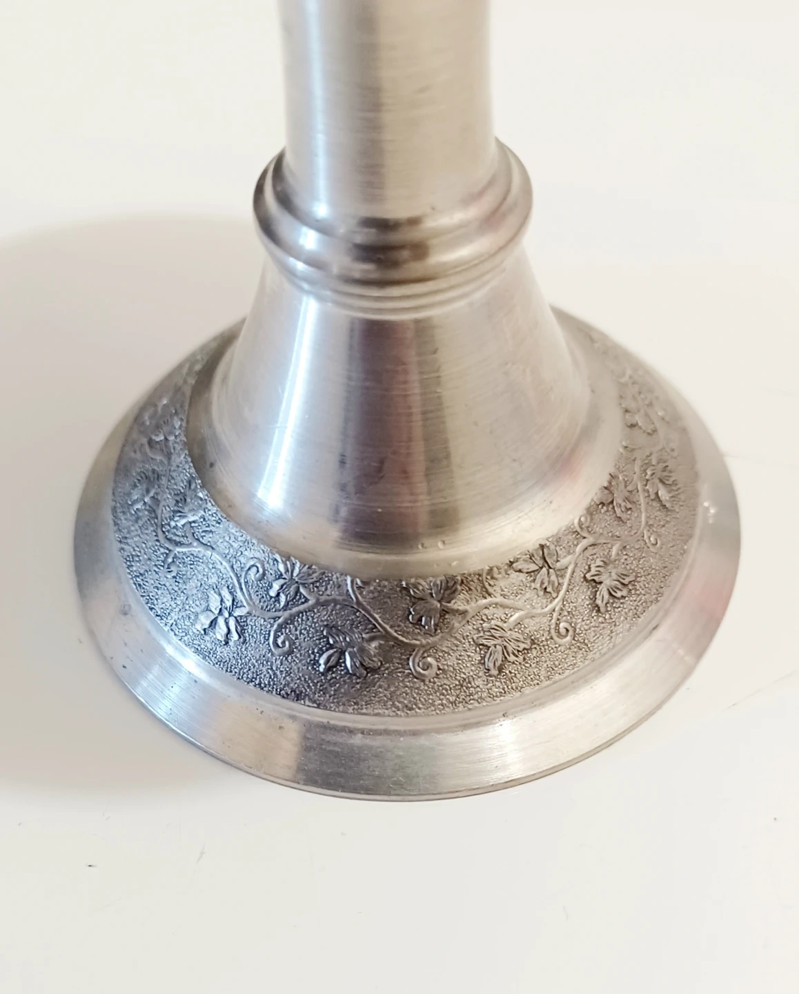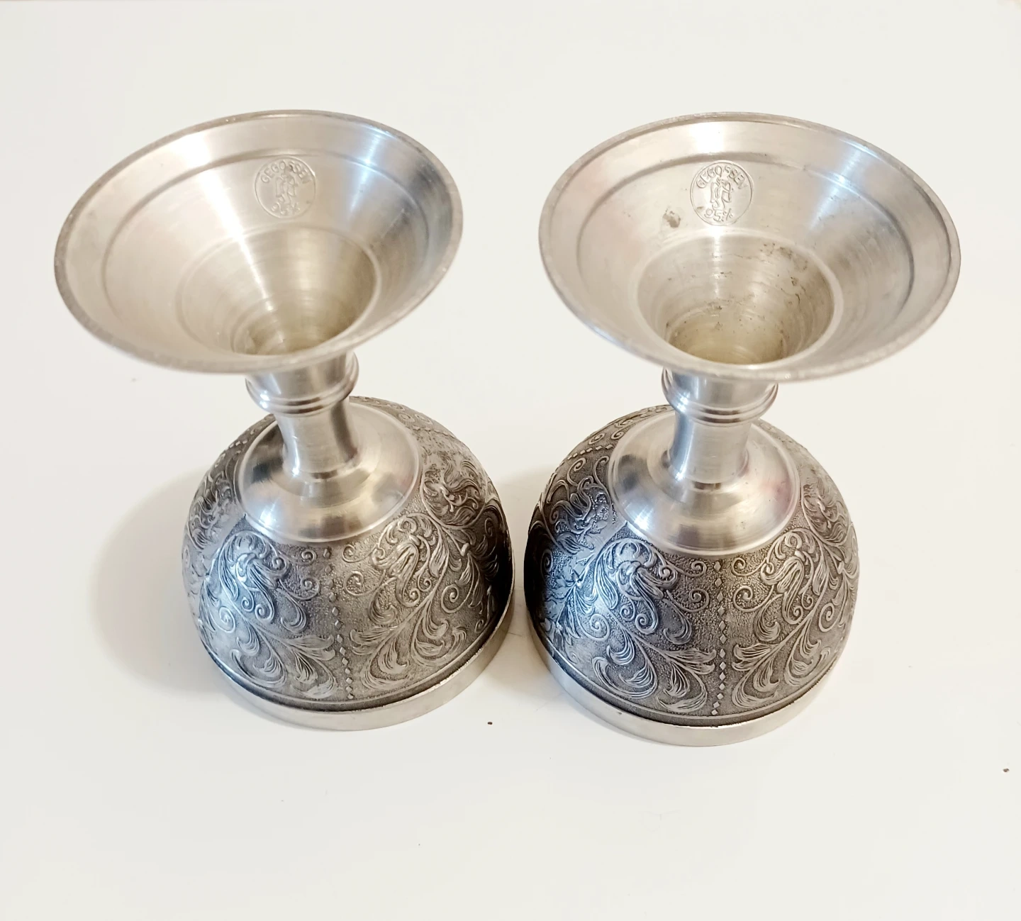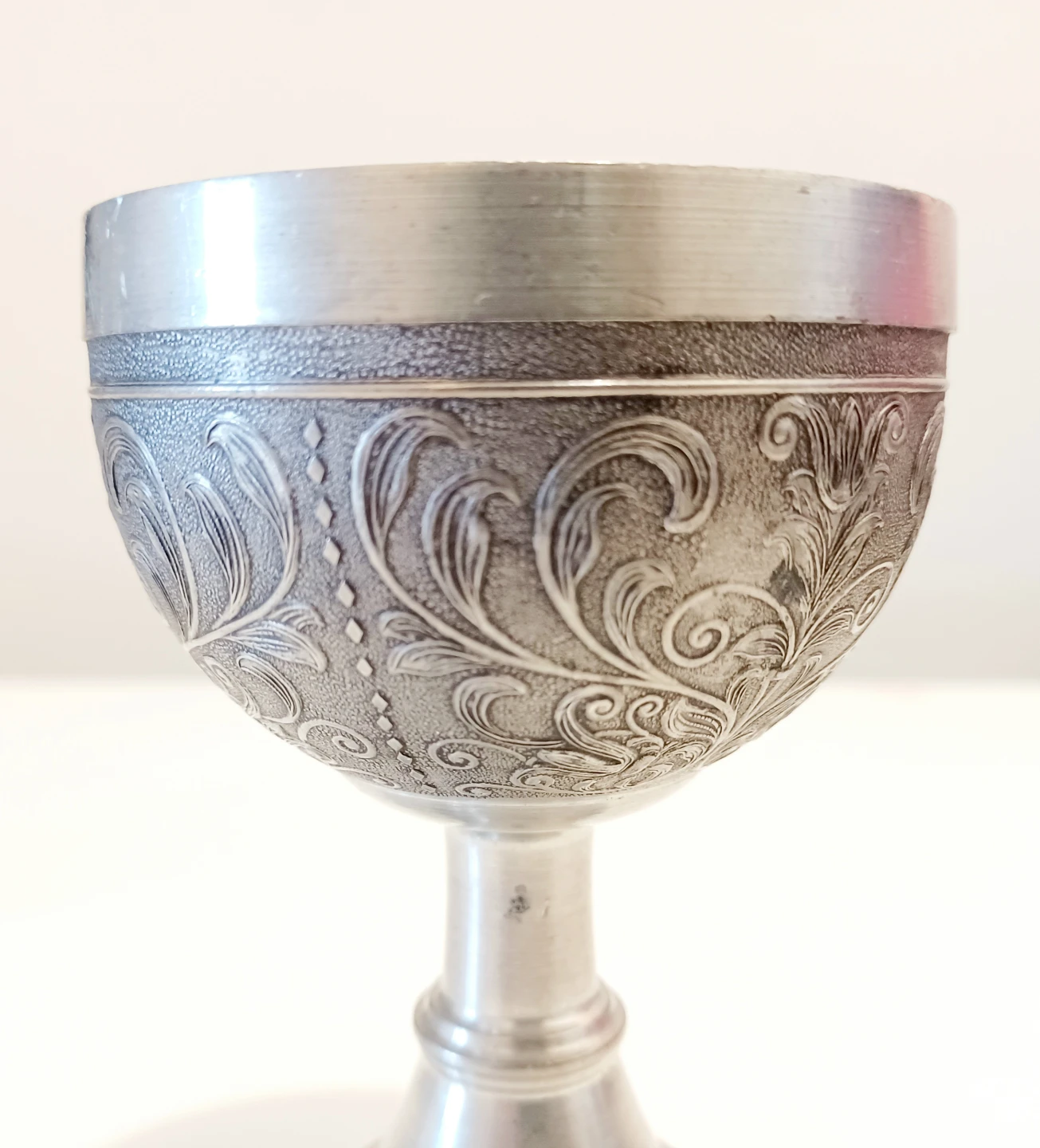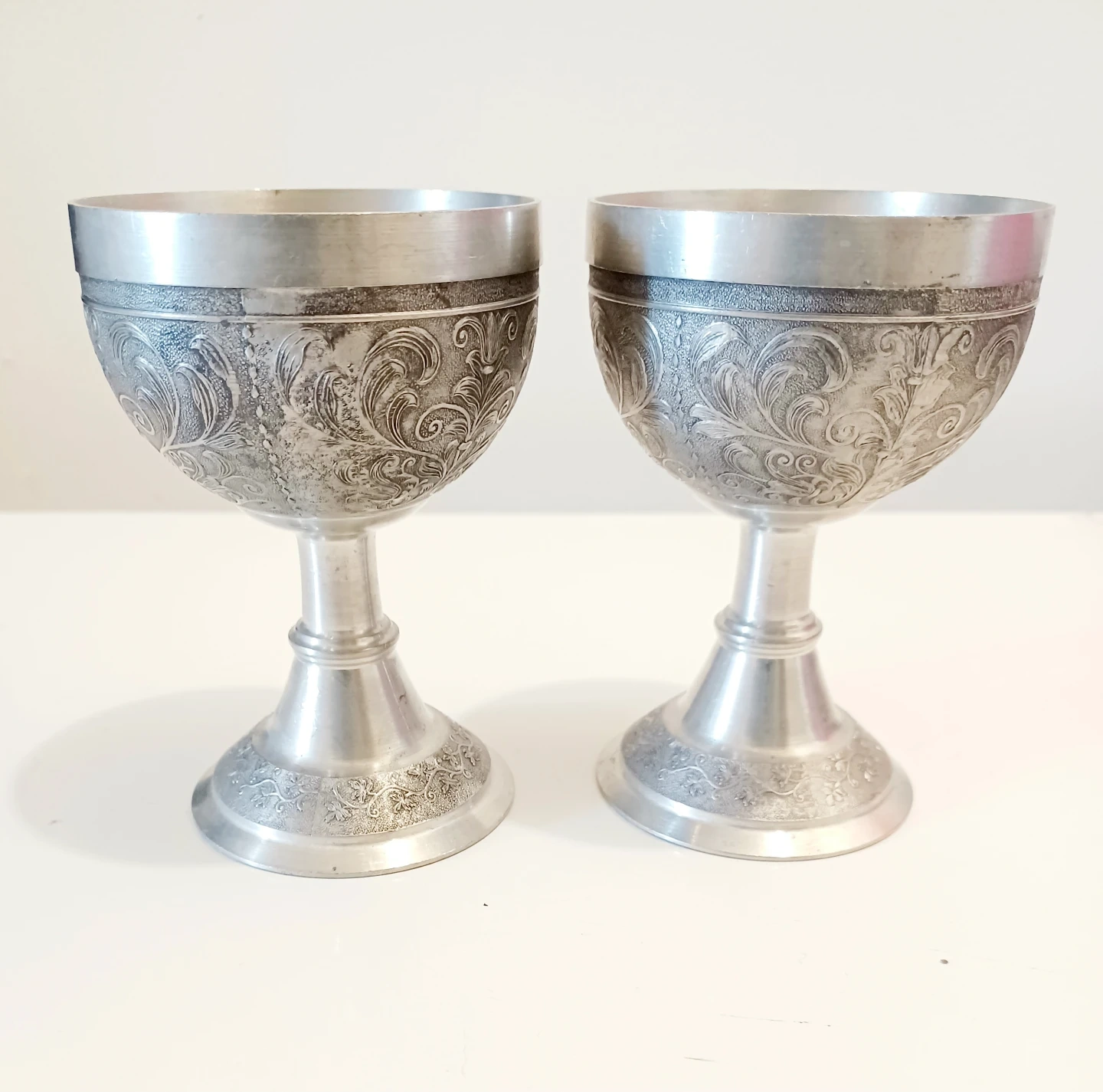 I'm offering a charm set of two Glaser Pewter goblets, each beautifully adorned with intricate floral designs. These goblets are in good condition, showcasing the classic craftsmanship of Glaser Pewter. Perfect for collectors or as a distinguished addition to any table setting.