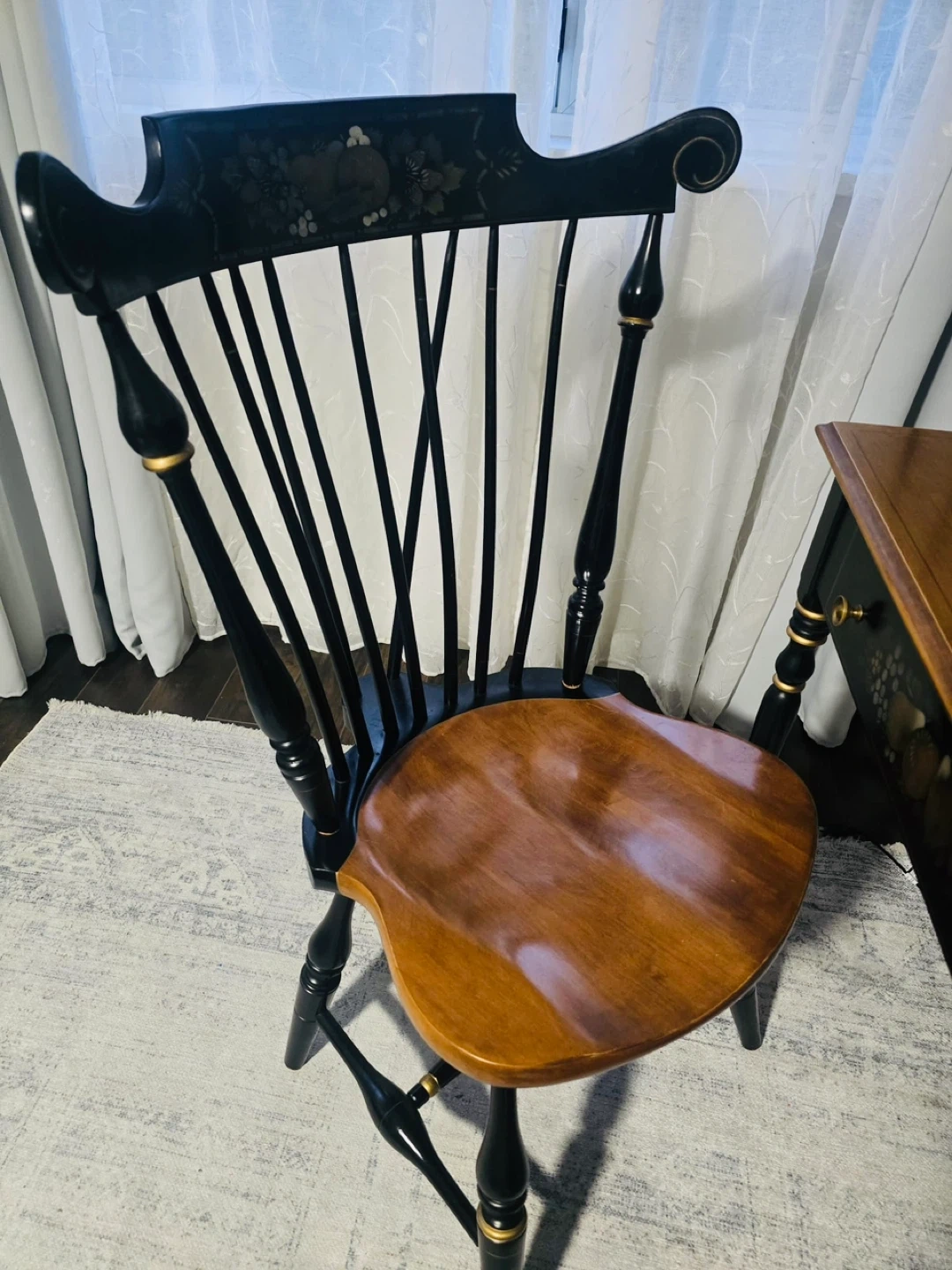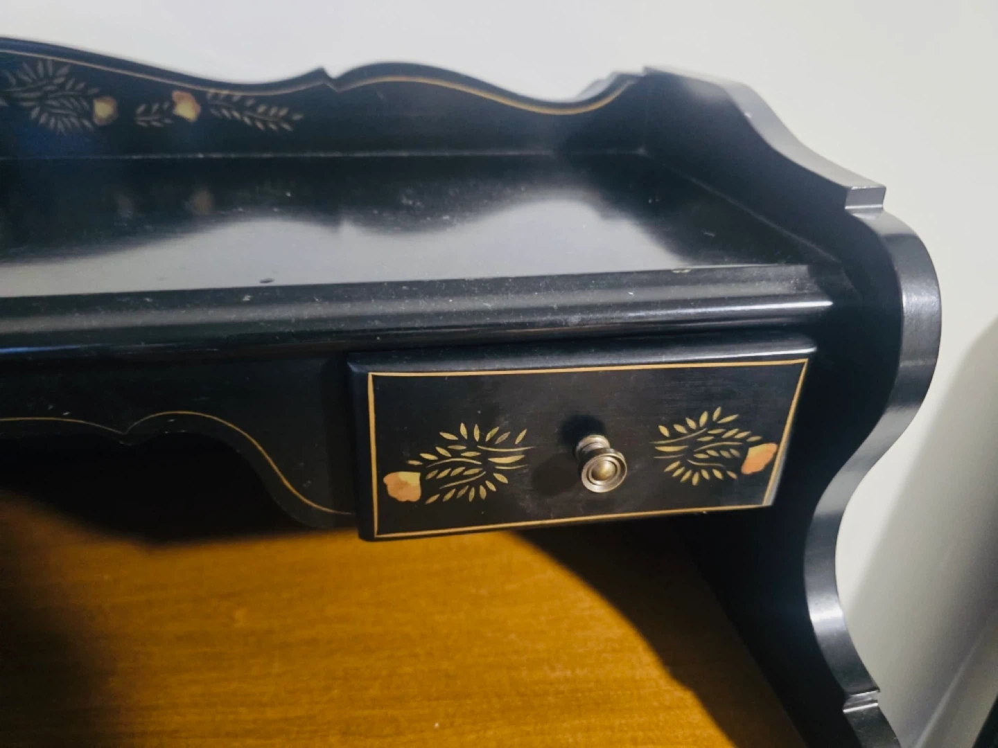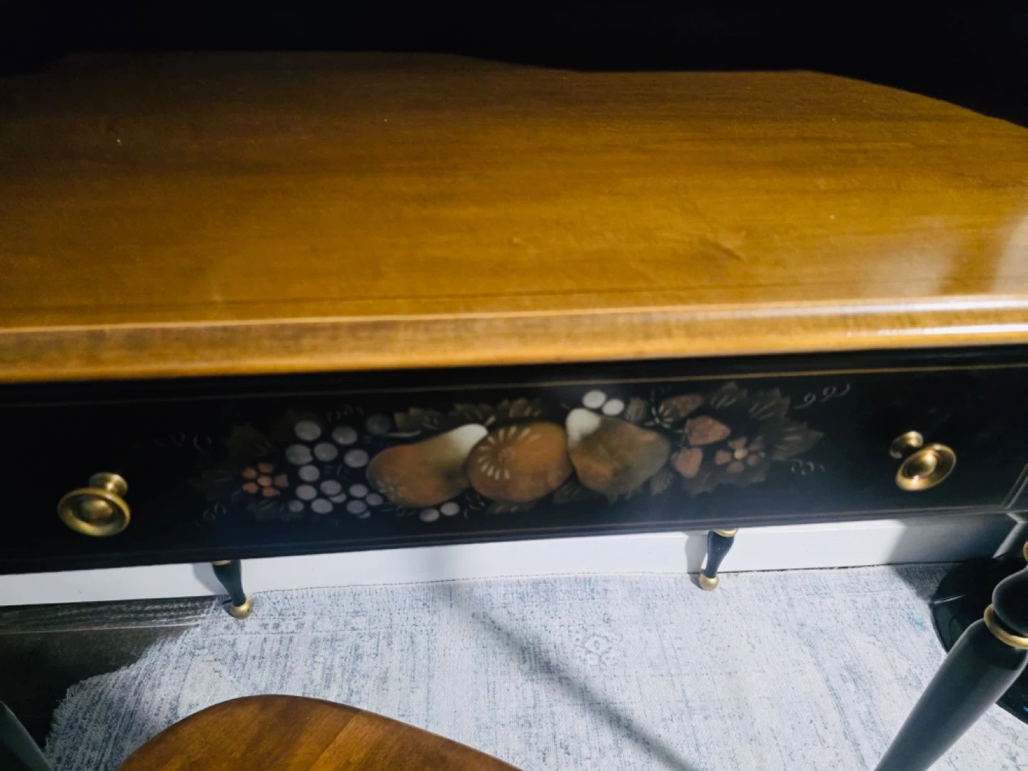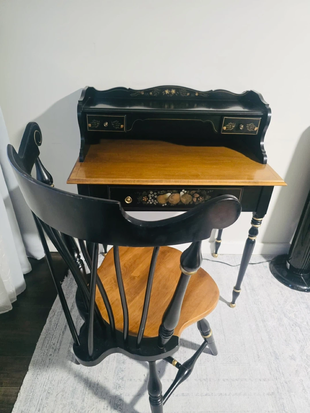 A refined vintage writing desk with matching chair, featuring hand-painted decorative details, a rich black finish, and warm wood surfaces. This is a beautifully proportioned, character-filled piece that elevates any thoughtfully designed space.