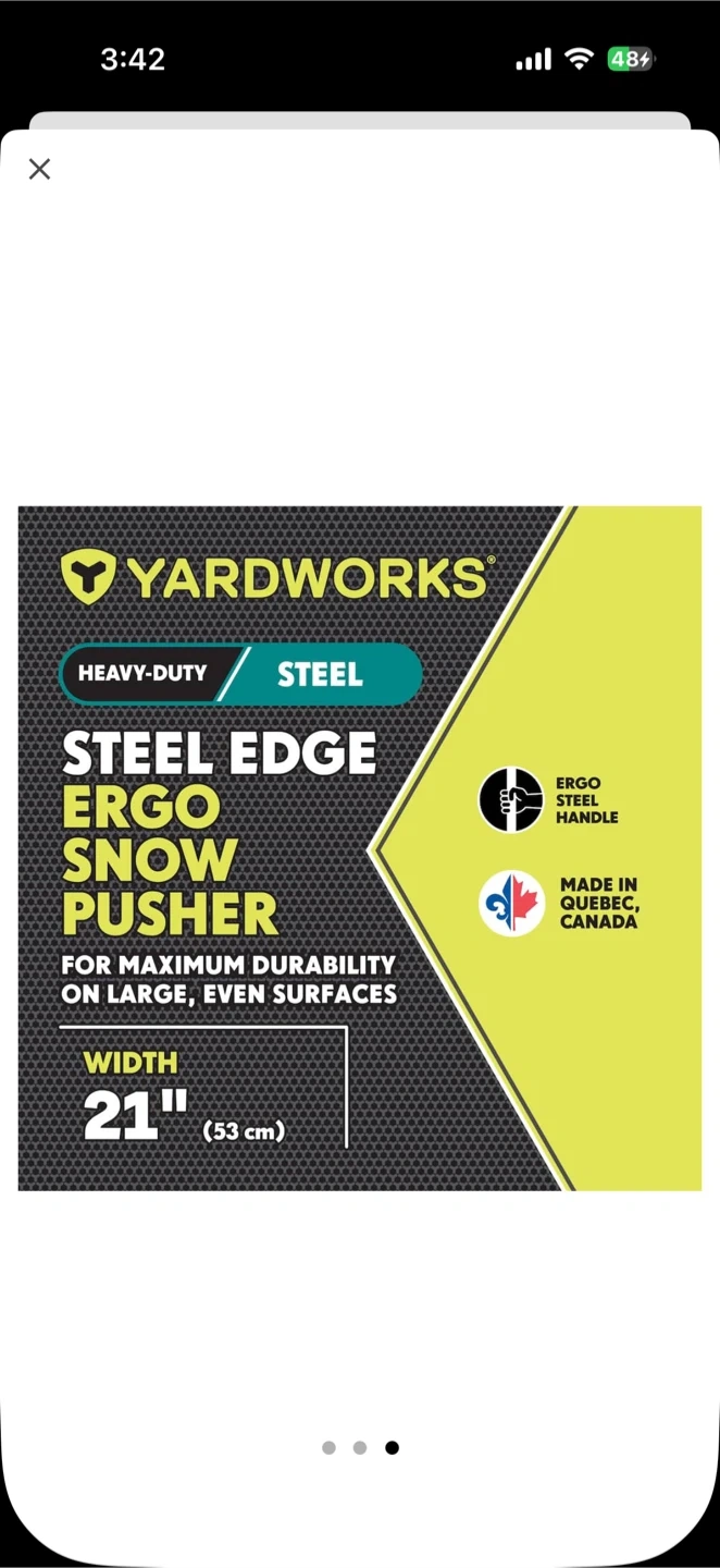 I'm selling a Yardworks Steel Edge Ergo Snow Pusher. It's designed for maximum durability on large, even surfaces.