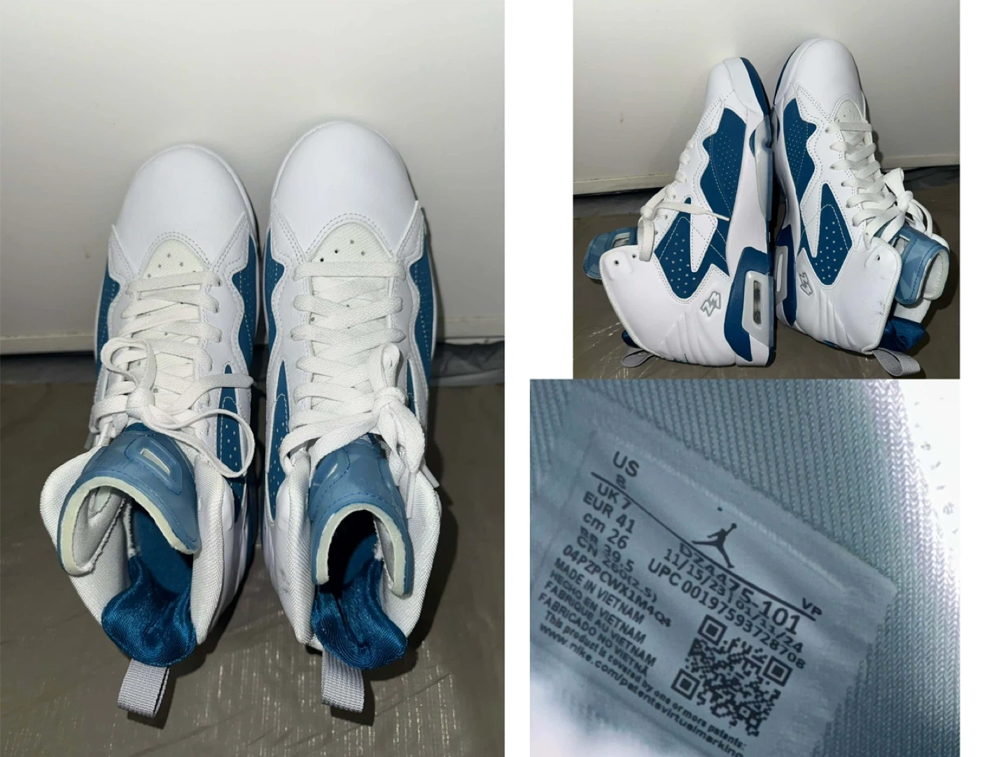 Selling a pair of Nike Air Jordan 6 Retro sneakers in white and navy, size US8.