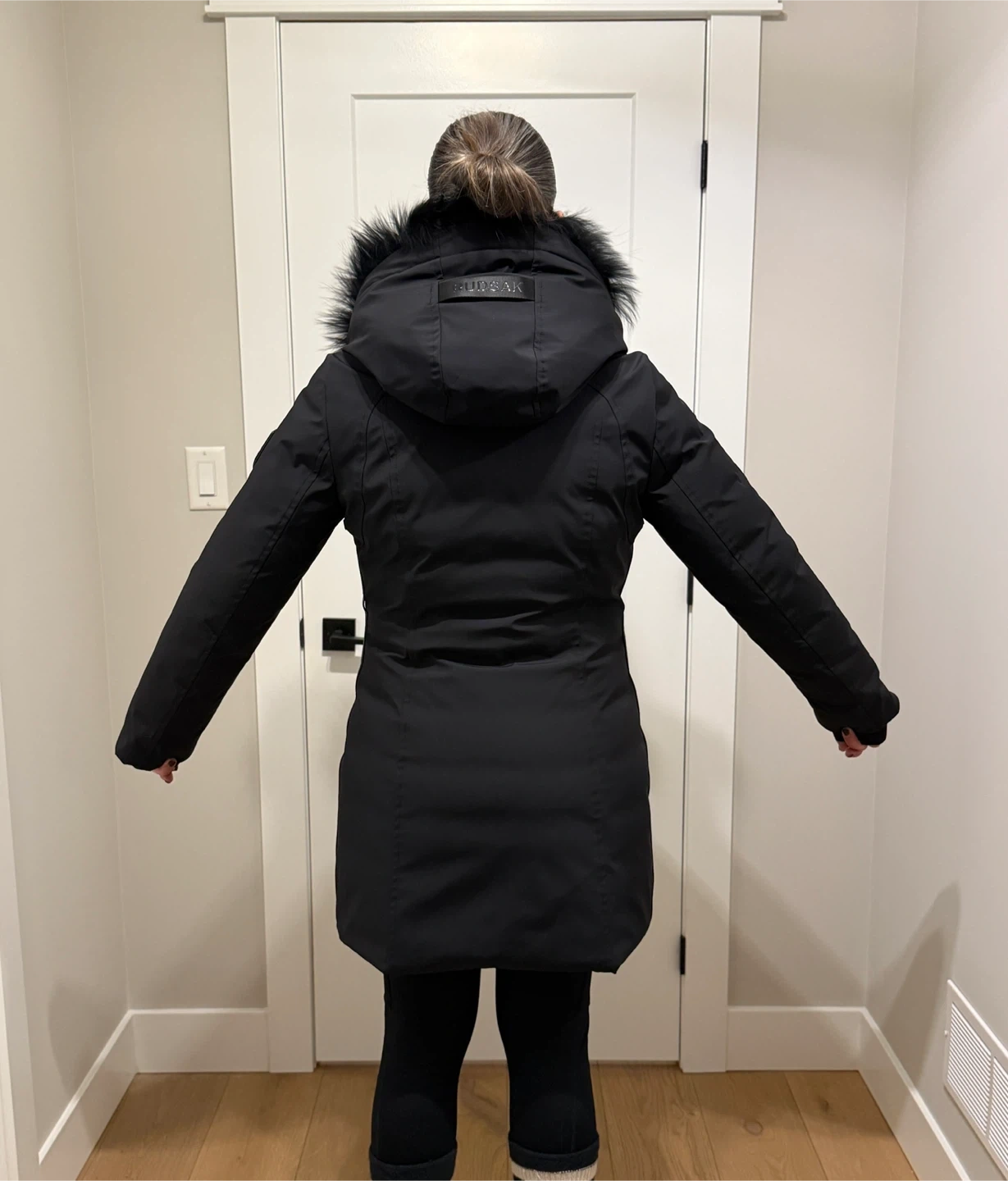 Never worn Rudsak fitted down parka, power strech shell designed for extreme conditions and coldest of days. Mid length. Fully removable fur trim, interior back pack straps, inner security pocket, storm cuffs and mesh eyelets under each arm for breathability.