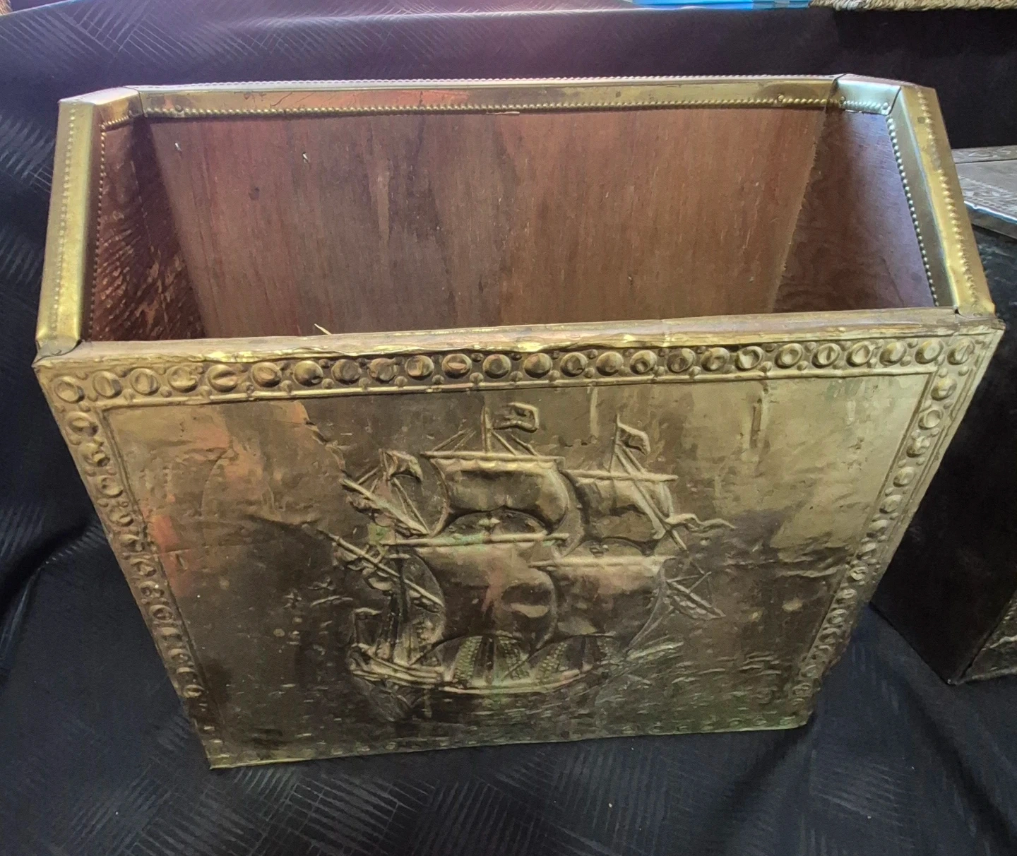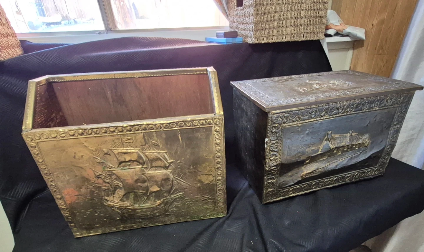 Selling a vintage brass embossed storage trunk. It has a unique design with embossed images. The trunk is in used condition. Also magazine holder.