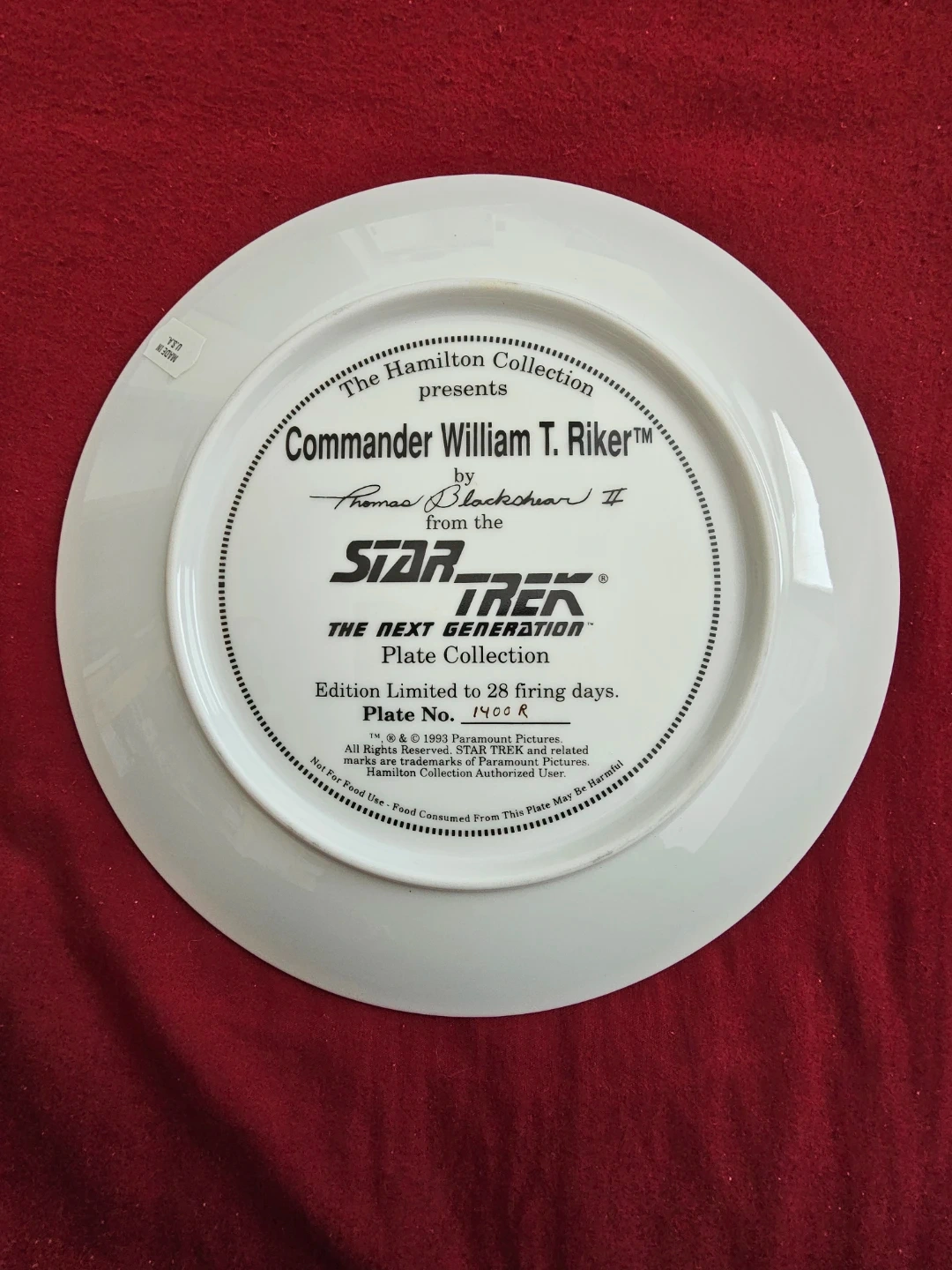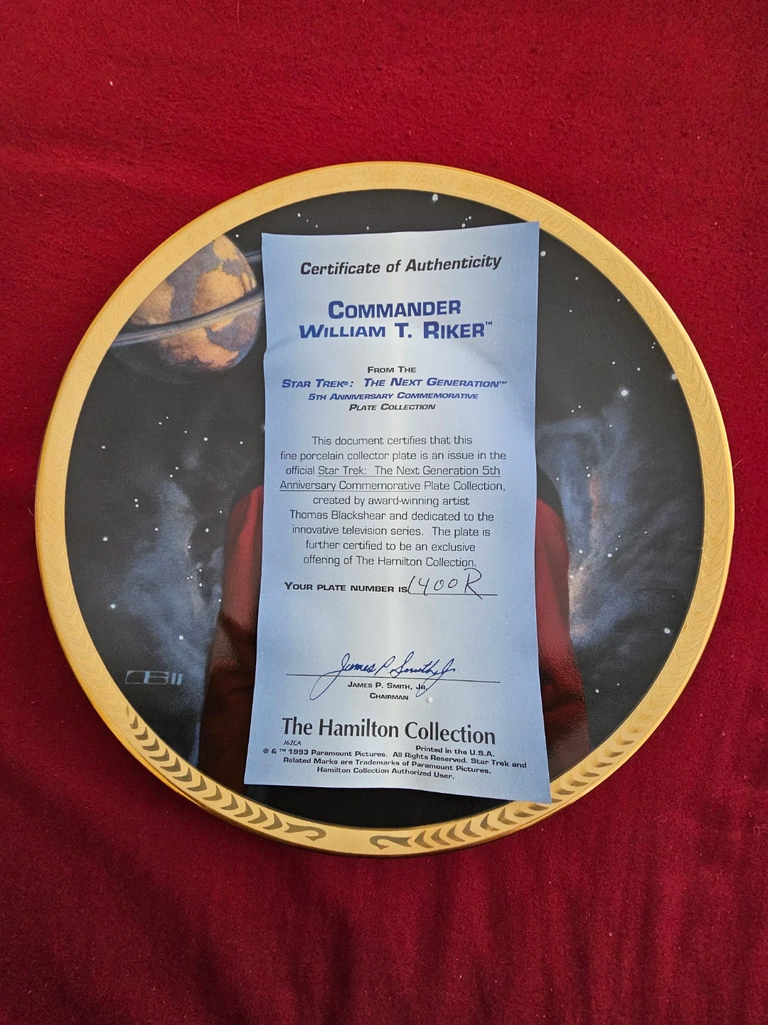 Thank you for considering this 1993 limited edition Cmdr. William Thomas Riker, as portrayed by Jonathan Frakes in Star Trek the Next Generation 8" Collectors Plate! This plate is from The Hamilton Collection, with artwork by artist Thomas Blackshear II, and is officially authorized by Paramount Pictures. It comes with a certificate of authenticity and is in MINT condition. A must-have for any Star Trek fan!
