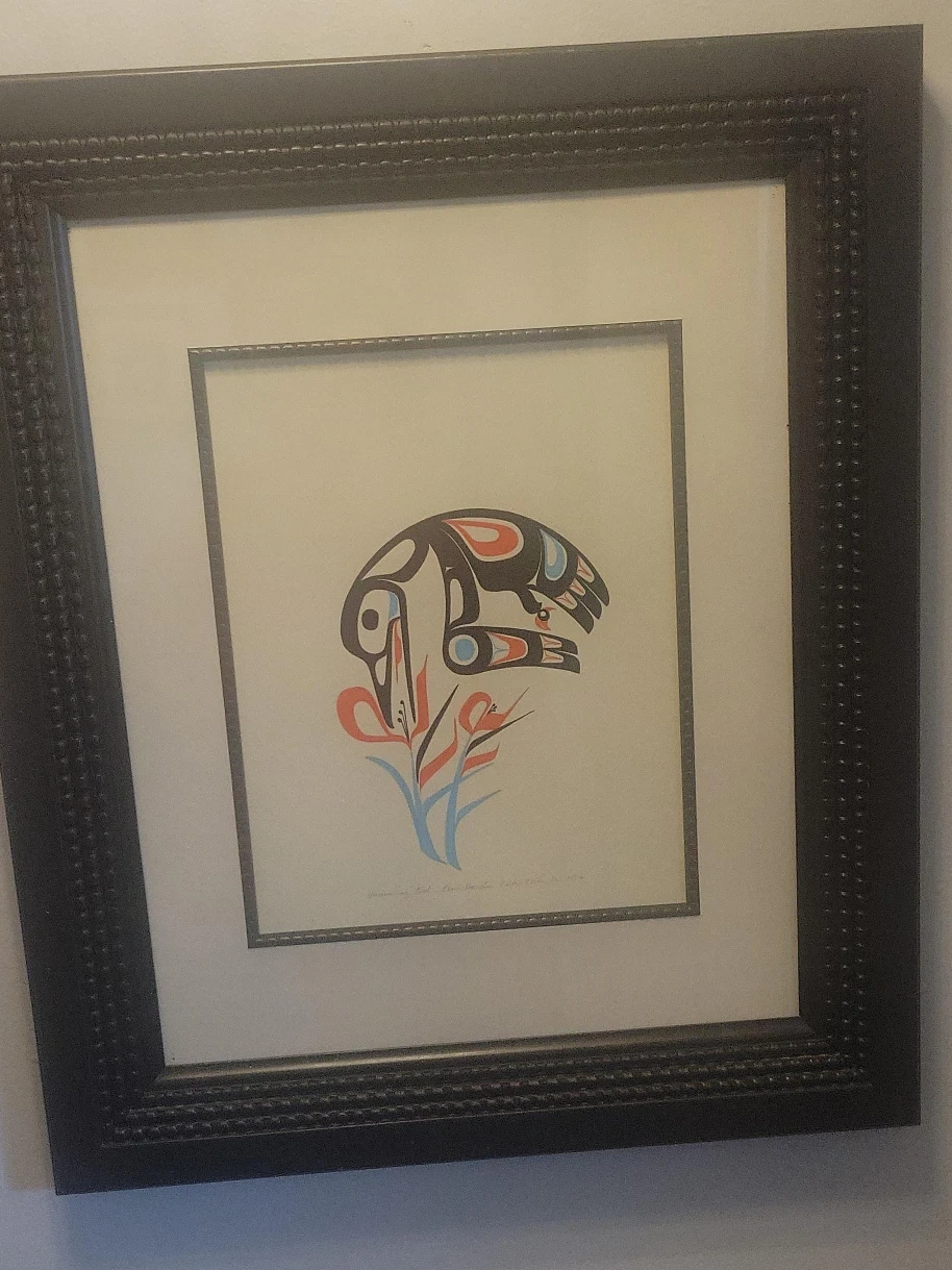 Here's a framed art work featuring an Indigenous design. The art piece showcases a stylized animal figure with floral elements in red, black, and blue tones. It is framed in a black frame with a textured finish. A unique piece to add to your home decor. Water color not a print