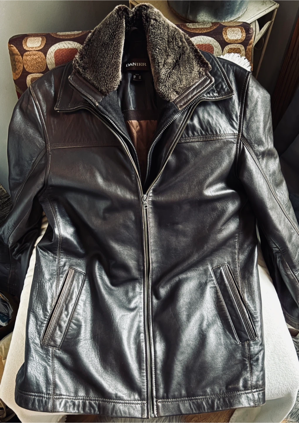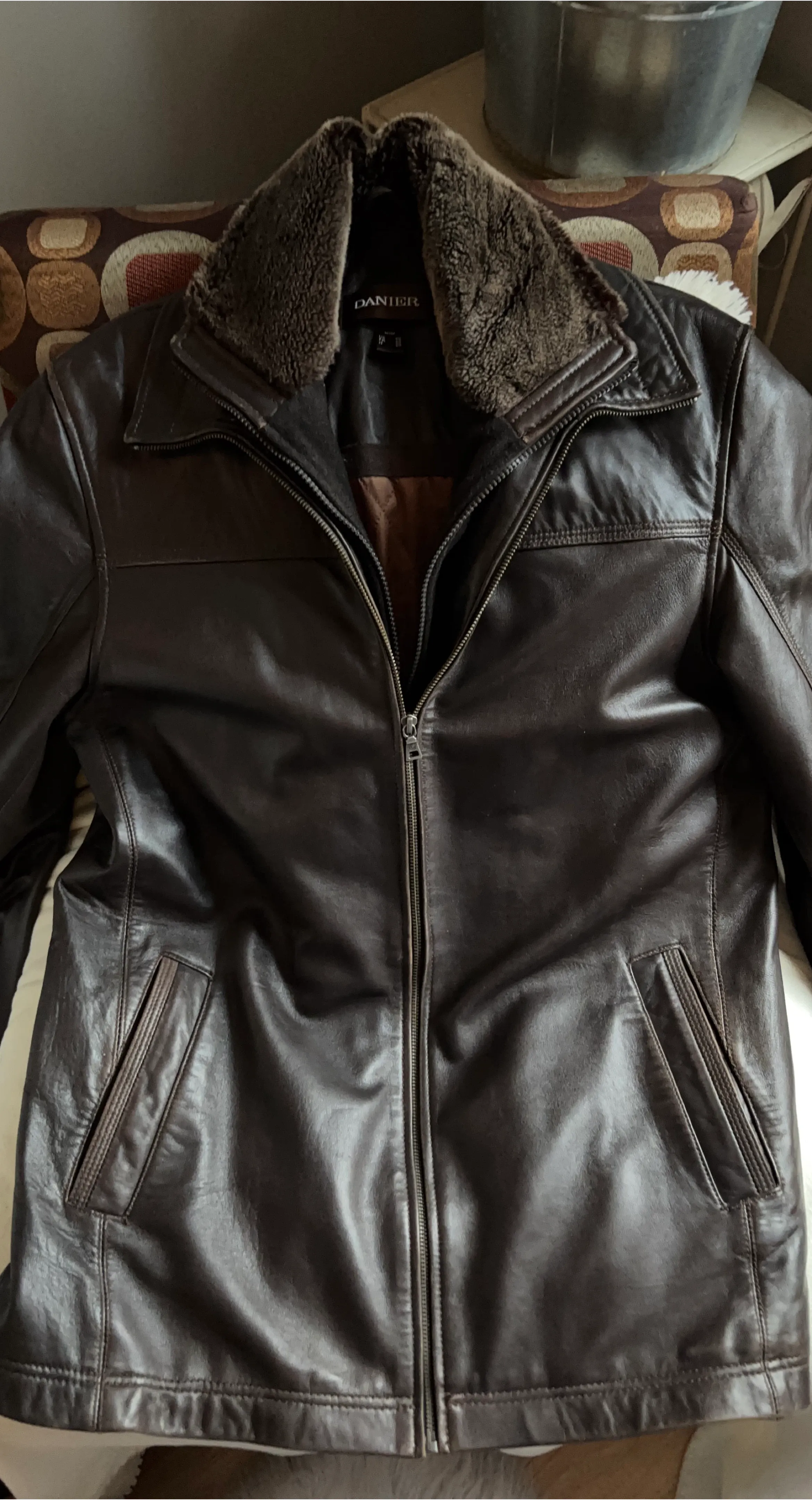 Here's a stylish Danier leather jacket, perfect for cooler weather! It features a cozy fur collar and a classic design. It's in great condition and ready for a new home.