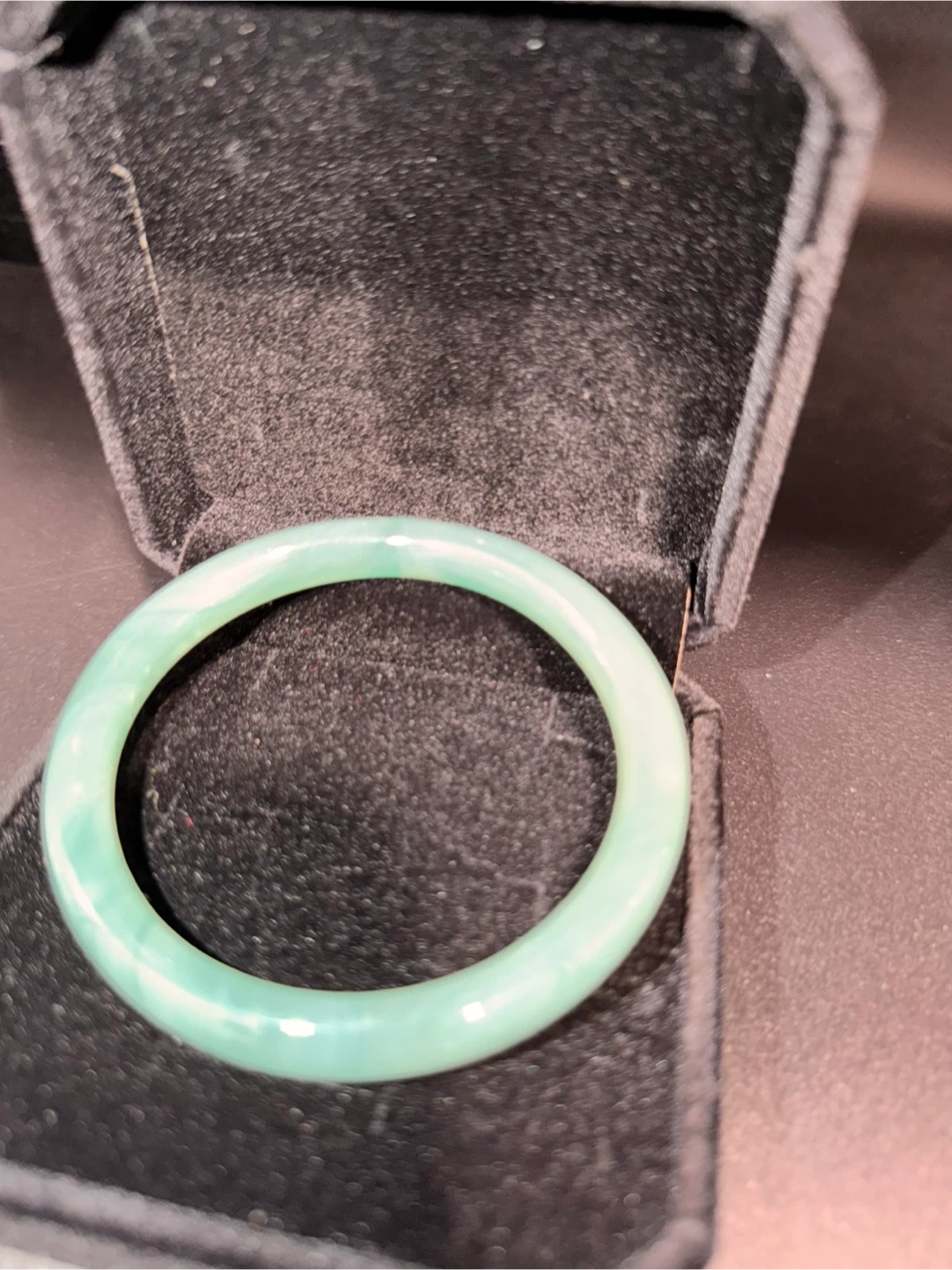 Selling two jade bangle bracelets. One is a light pink colour and the other is light green. Comes with the box. Please see the size chart in the photos to determine if the bangle is the right size for you!