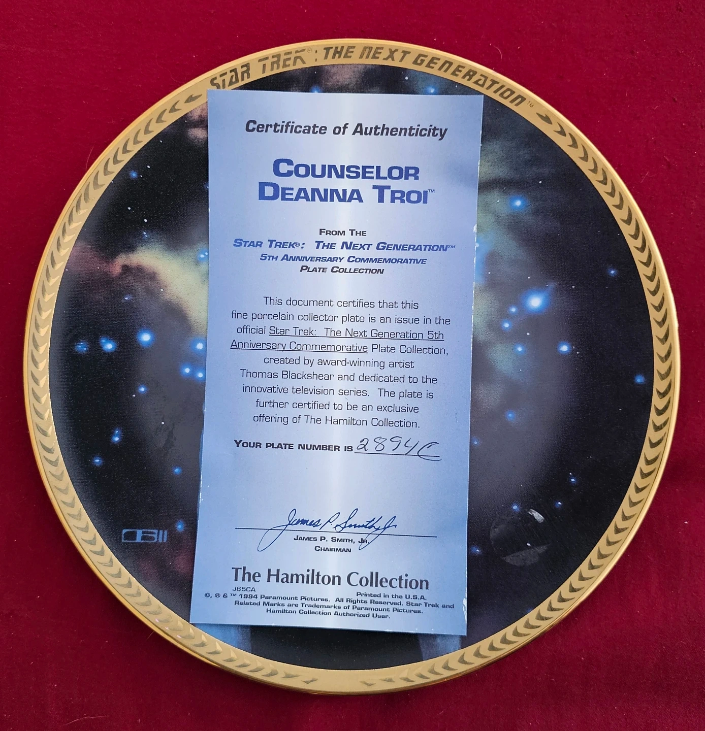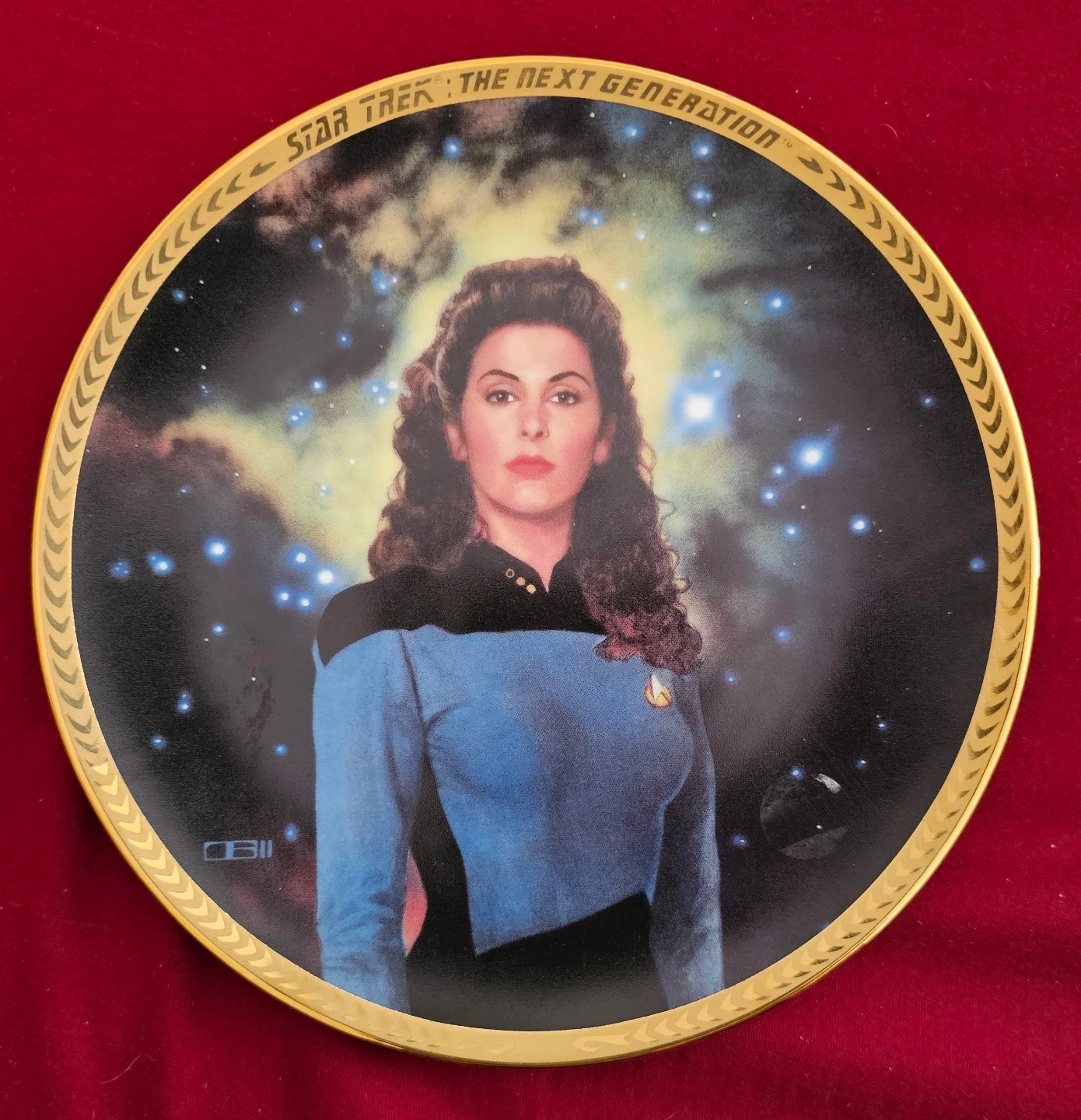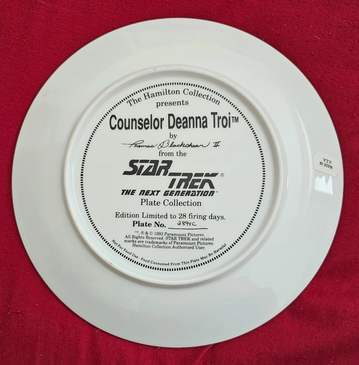 Thank you for considering this 1993 limited edition Counselor Deanna Troi, as portrayed by Marina Sirtis in Star Trek the Next Generation Collectors Plate! This 8" plate is from The Hamilton Collection, with artwork by artist Thomas Blackshear II, and is officially authorized by Paramount Pictures. It comes with a certificate of authenticity and is in MINT condition. A must-have for any Star Trek fan!