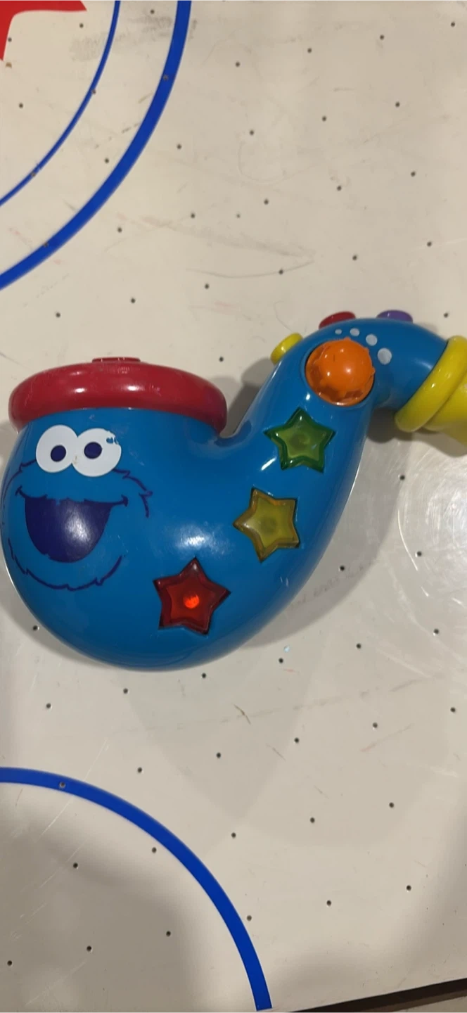 Selling a cute Sesame Street Cookie Monster saxophone toy! It's blue with a red top and has star-shaped lights. Perfect for little ones who love music and Cookie Monster