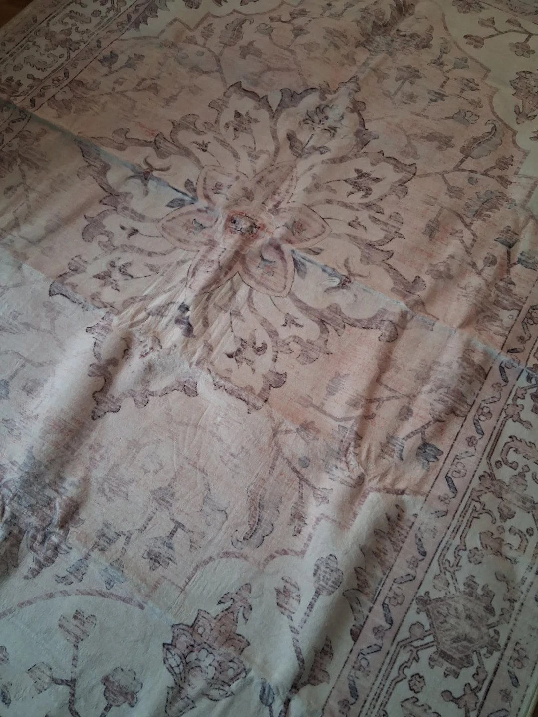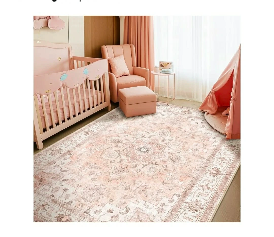 Selling a lovely area rug in a subtle pink and beige color palette. It measures approximately 59 inches by 83 inches. It's easy to clean, machine washable, and vacuum-friendly. The low pile design ensures it won't block doors and is robot vacuum friendly
