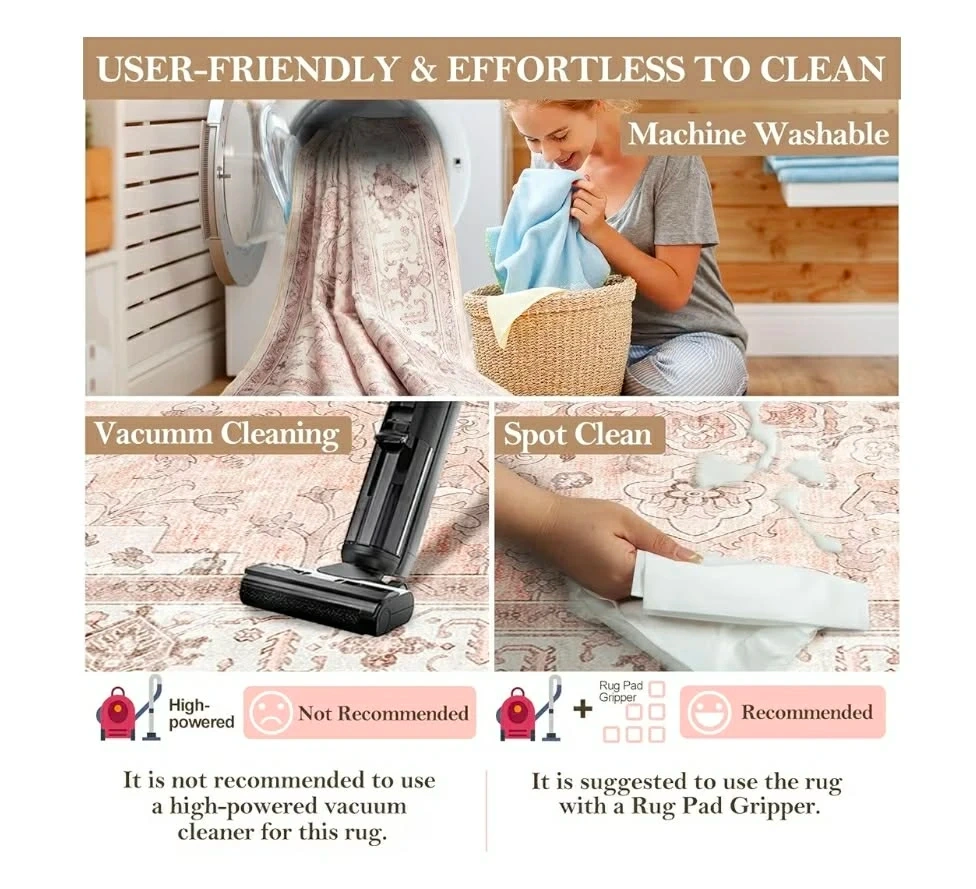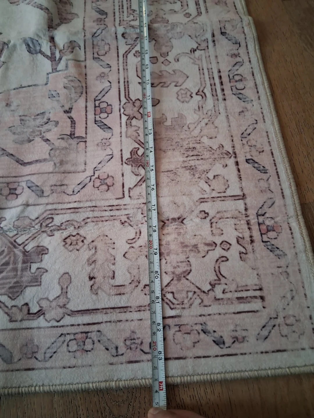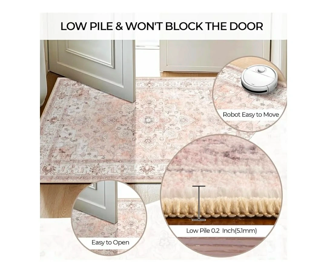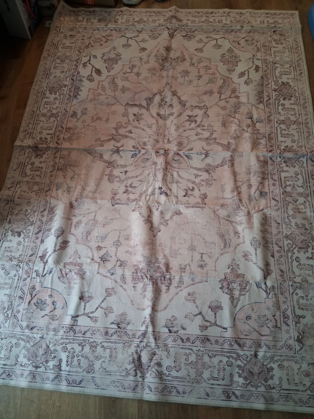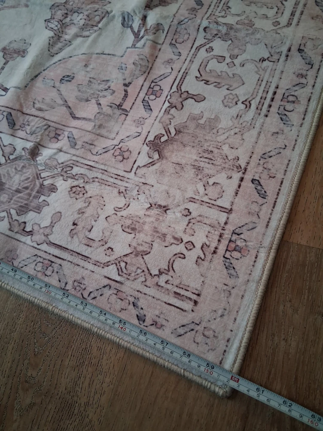 Selling a lovely area rug in a subtle pink and beige color palette. It measures approximately 59 inches by 83 inches. It's easy to clean, machine washable, and vacuum-friendly. The low pile design ensures it won't block doors and is robot vacuum friendly