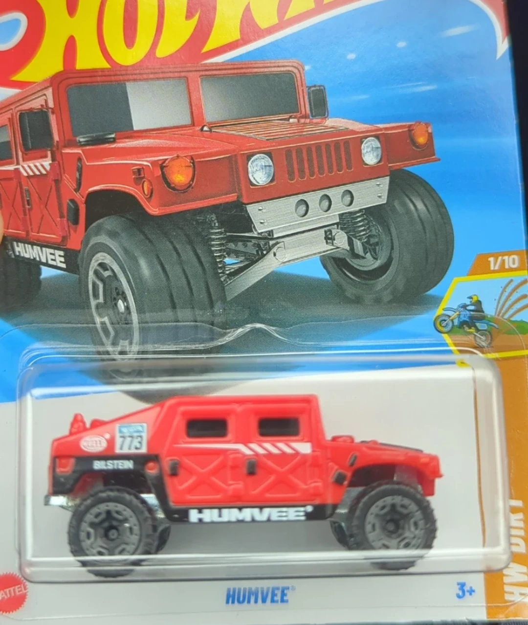 Selling a Hot Wheels Humvee in red! 55/250 HW Dirt 1/10 year 2024.t's still in its original packaging and ready for a new home with a collector or someone who loves toy cars