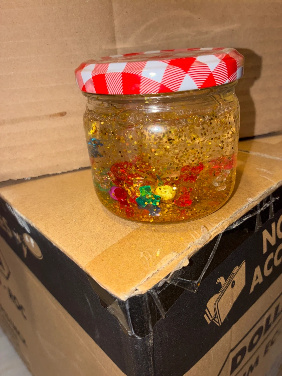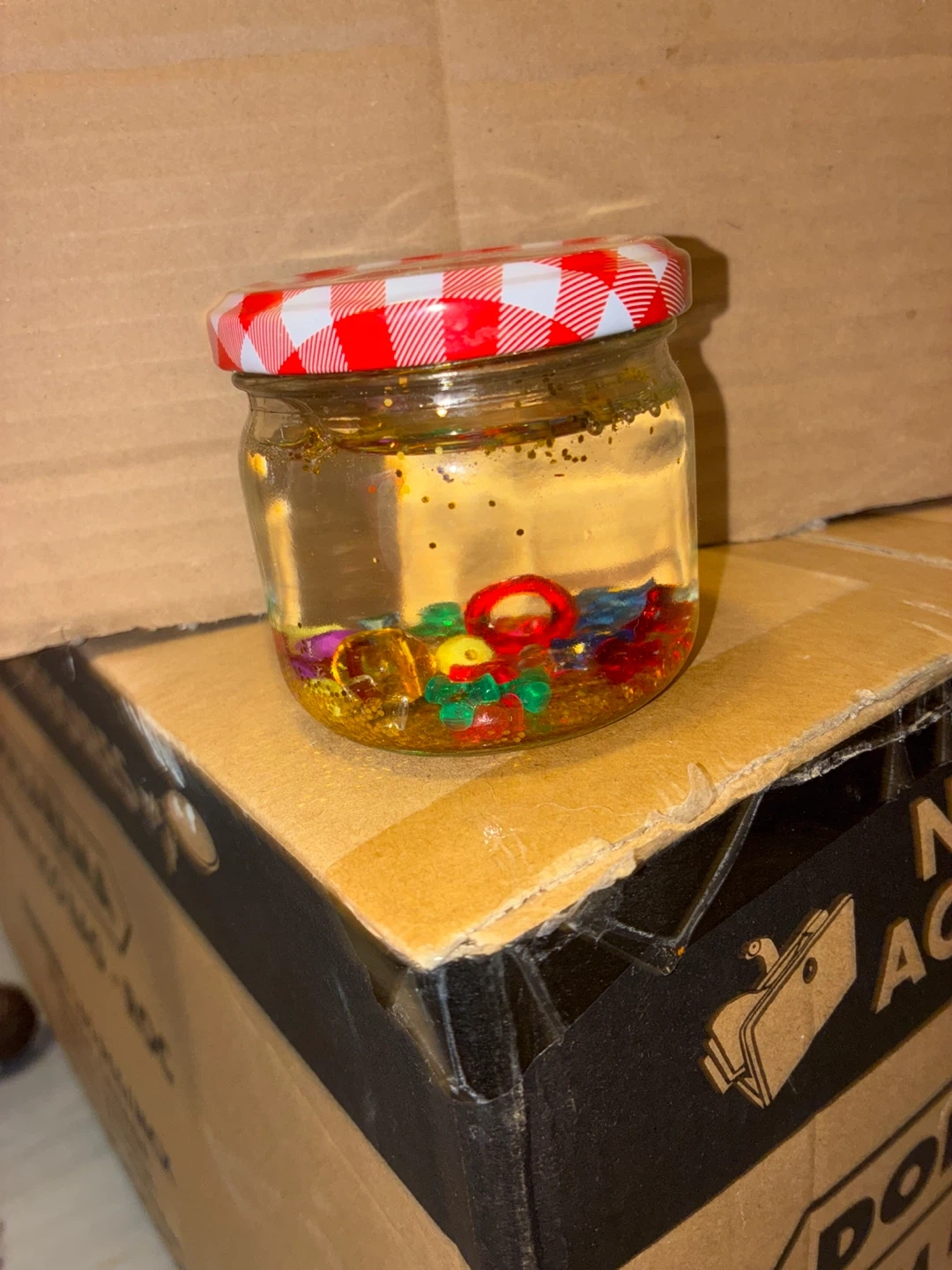 This is a handmade sensory jar filled with colourful beads and glitter in a clear liquid. It's great for kids to watch and enjoy the movement of the items inside