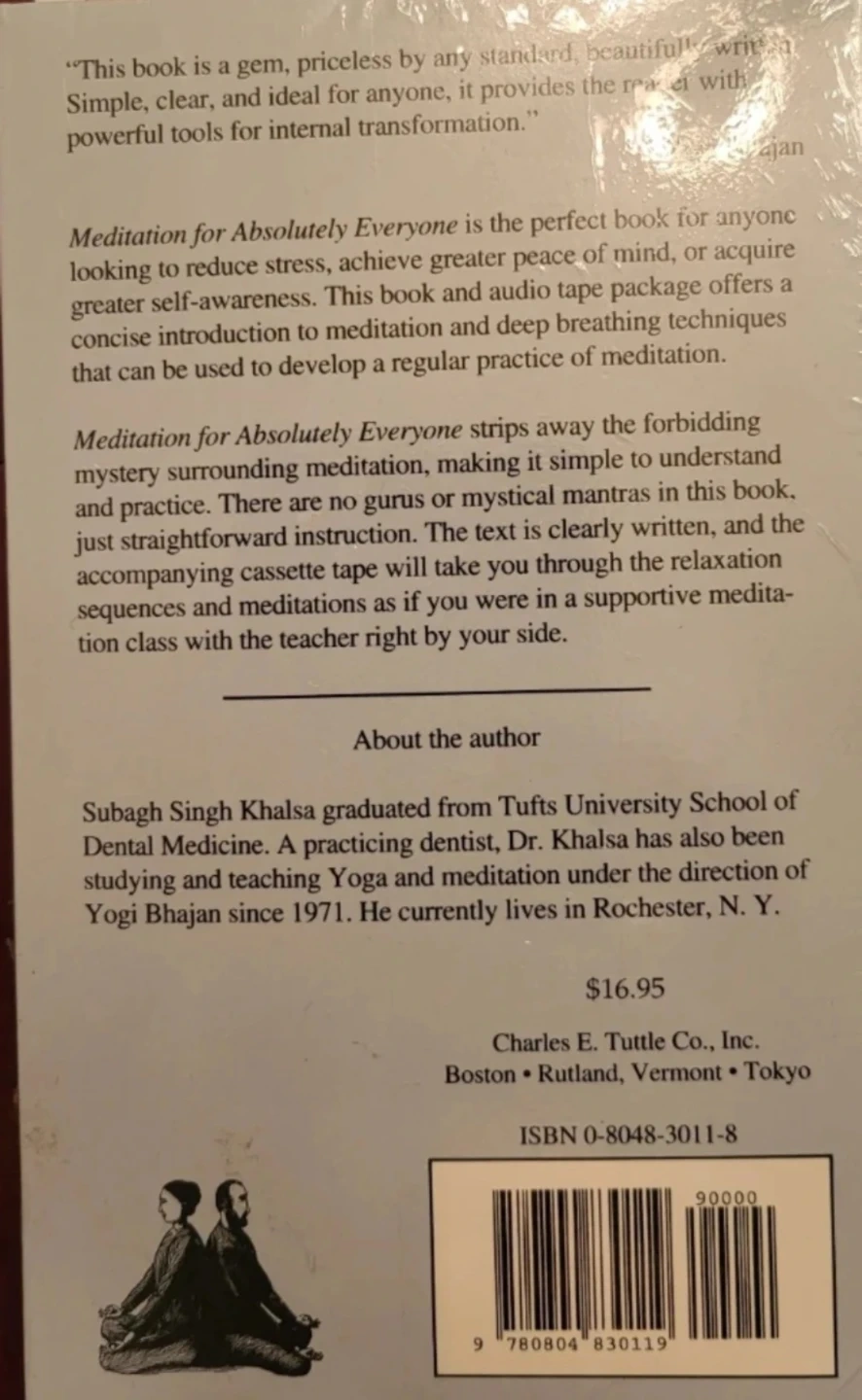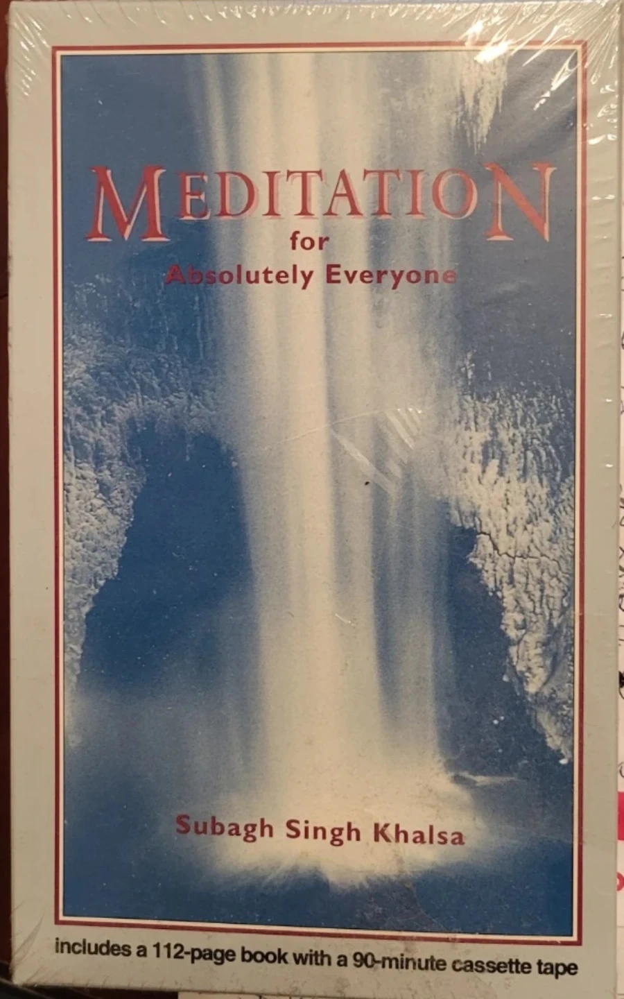 "Meditation for Absolutely Everyone" by Subagh Singh Khalsa. Package includes a 112-page book and a 90-minute cassette tape. It's a perfect book for anyone looking to reduce stress and achieve greater peace of mind.