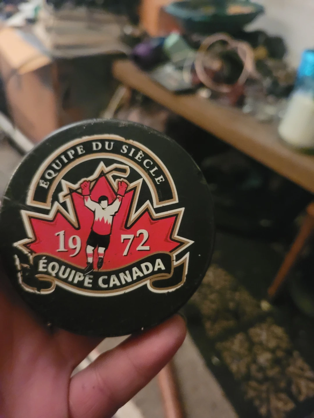 Selling a Marcel Dionne Equipe Canada 1972 hockey puck. It features a picture of Marcel Dionne. The puck also has the Equipe Canada logo and the year 1972 on it