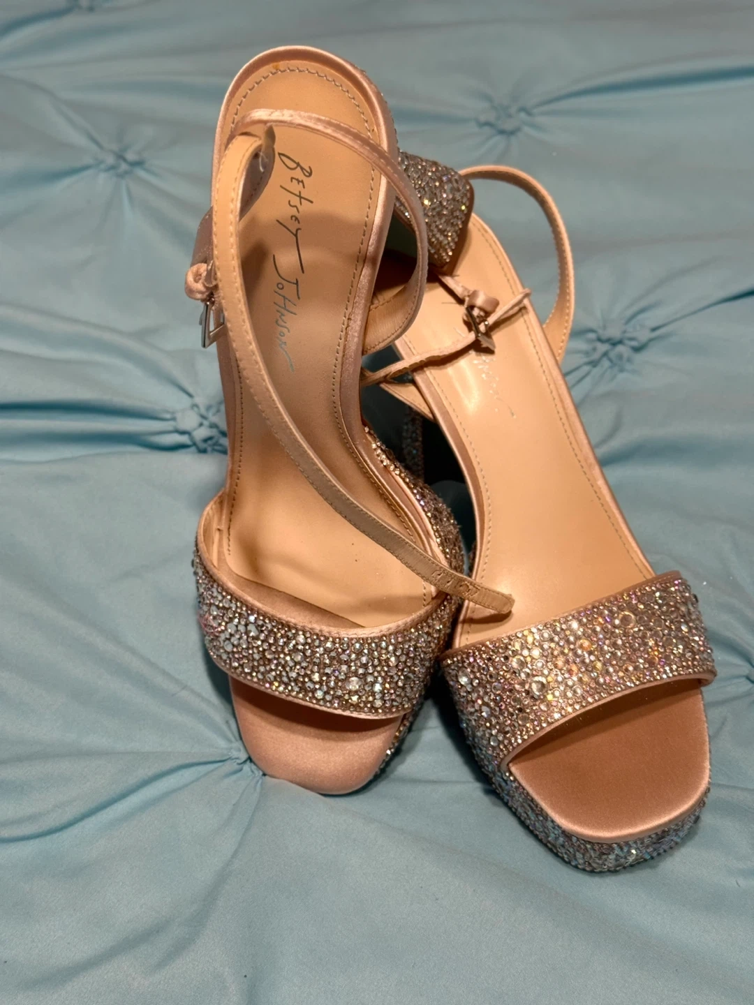 These Betsey Johnson heels are perfect for adding some sparkle to your outfit! They feature a beautiful rhinestone design and a delicate strap. They are in good condition and come with the original box
