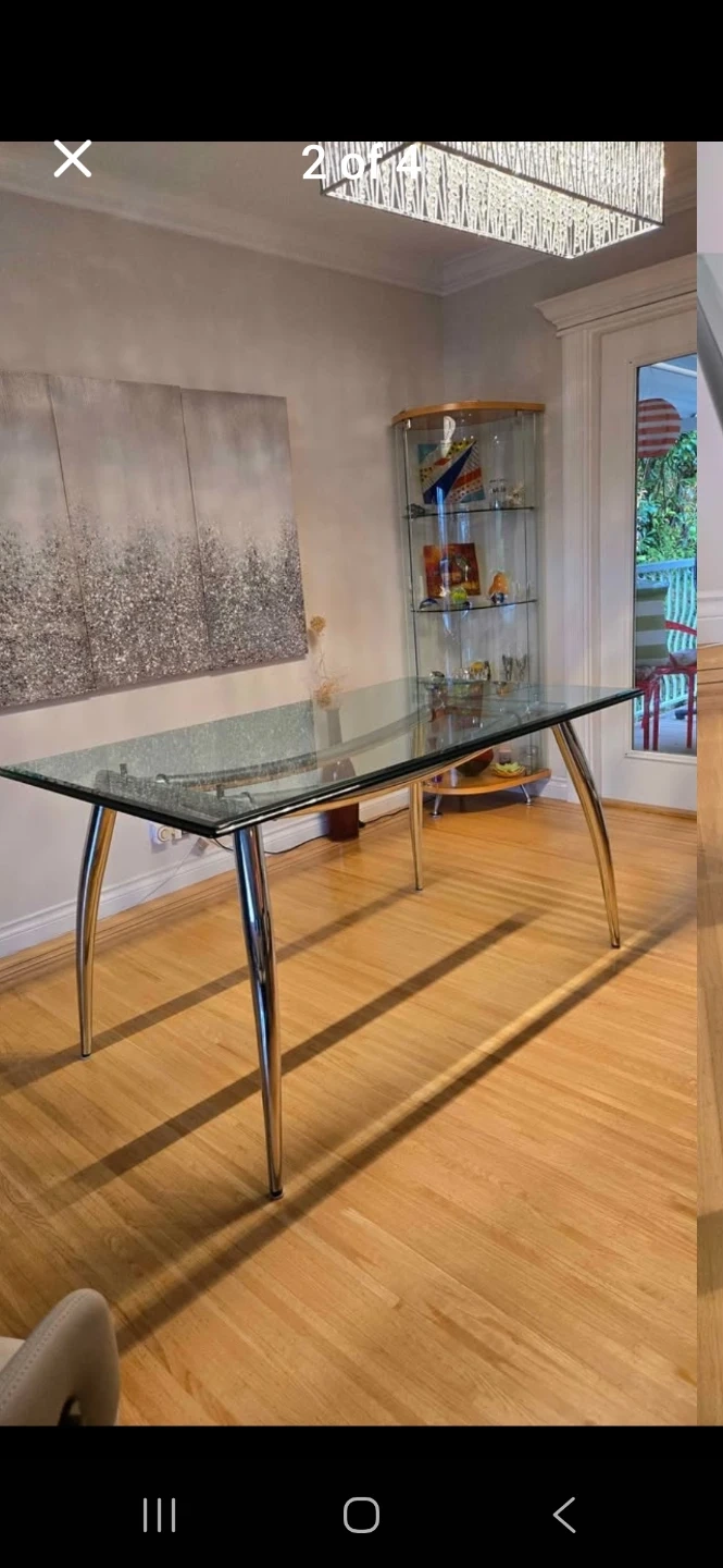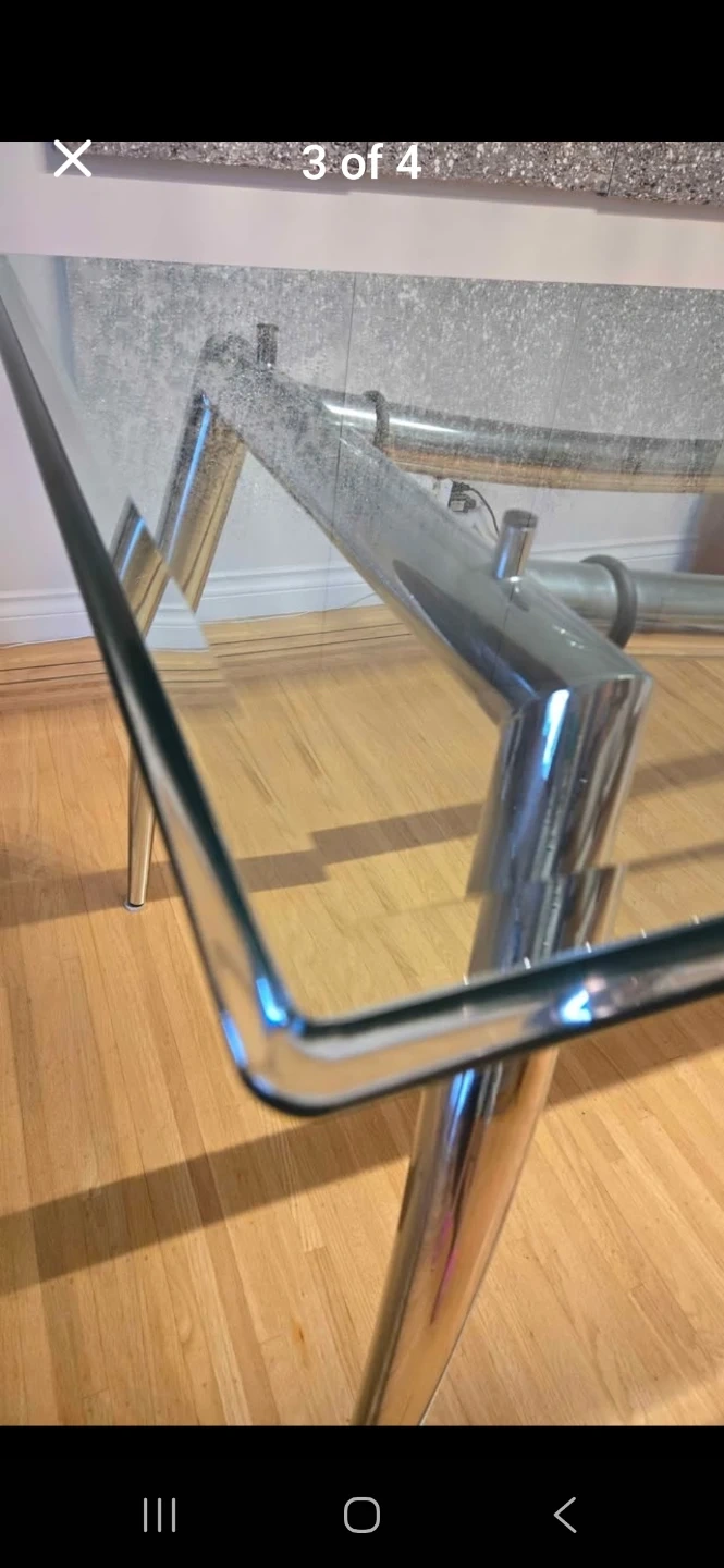 Selling a glass top dining table with chrome legs. It's in good condition and would be a nice addition to any dining room!