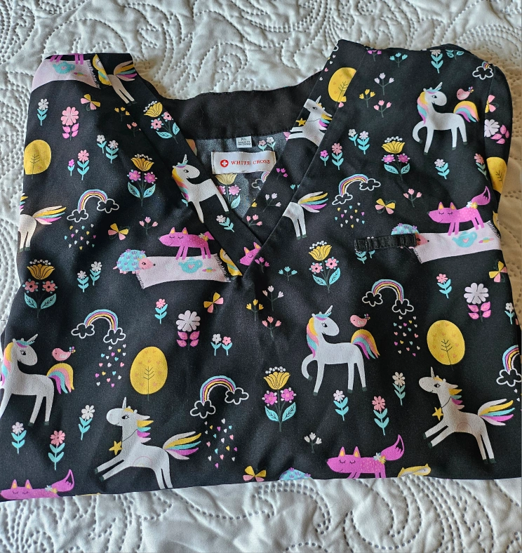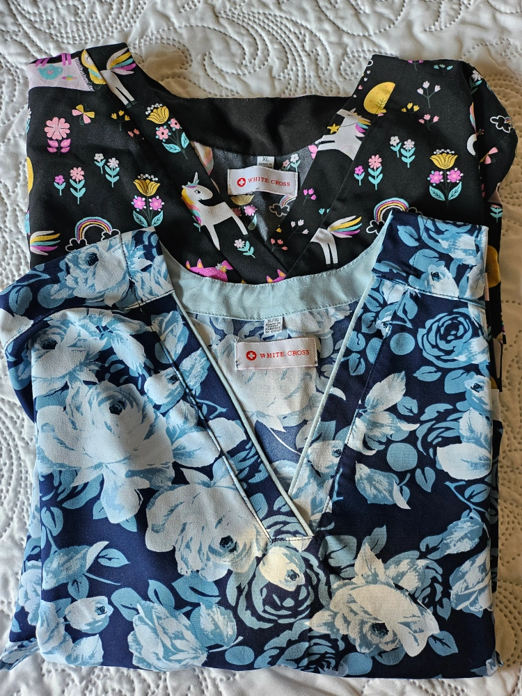 Two White Cross scrubs in excellent condition! One is a blue floral pattern, and the other is a fun unicorn print. Both are size XL.