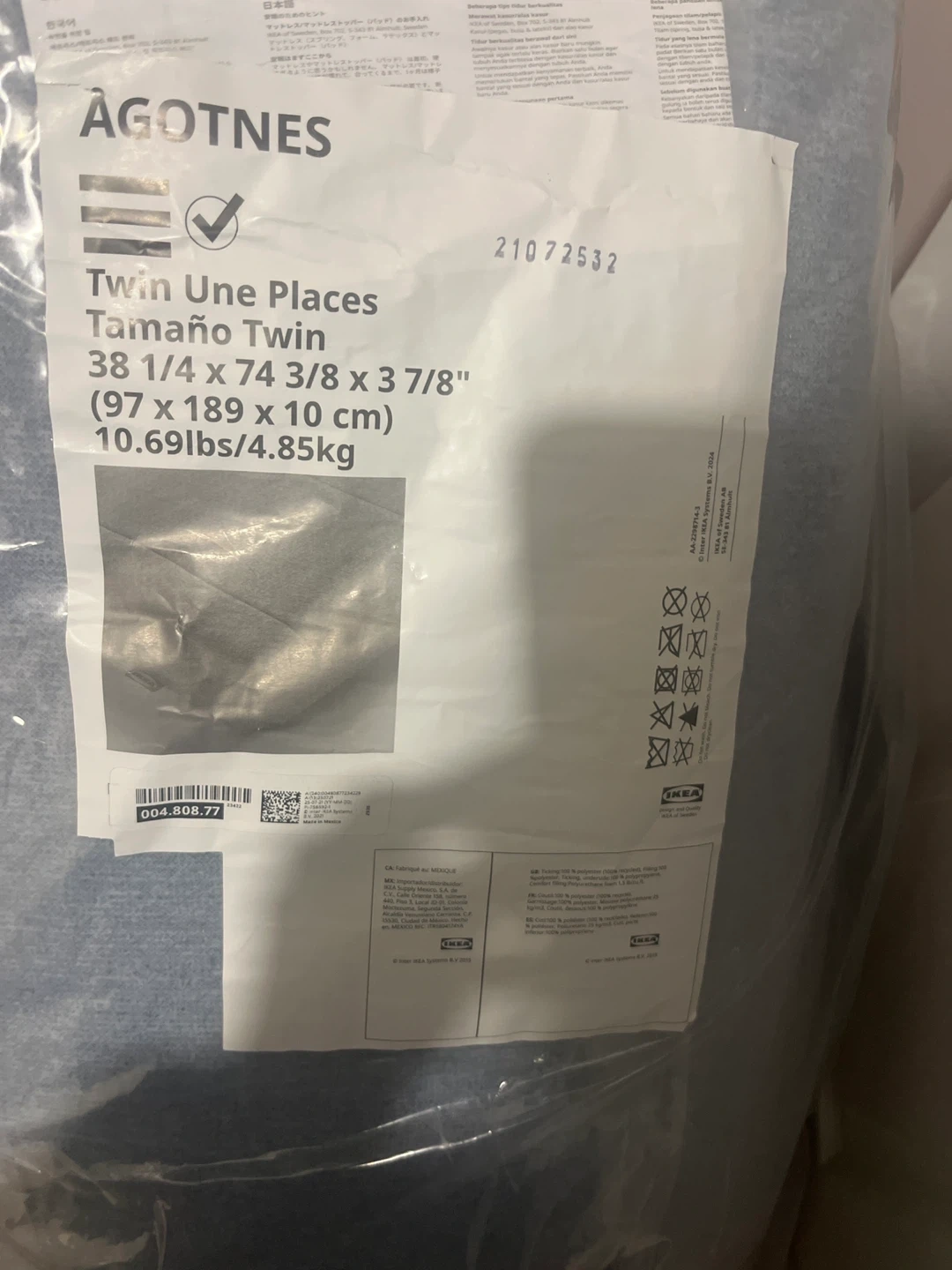 Selling a new twin size IKEA ÅGOTNES mattress. The dimensions are 38 1/4 x 74 3/8 x 3 7/8 inches (97 x 189 x 10 cm). It weighs 10.69lbs/4.85kg. Great for a spare room or a kid's bed!