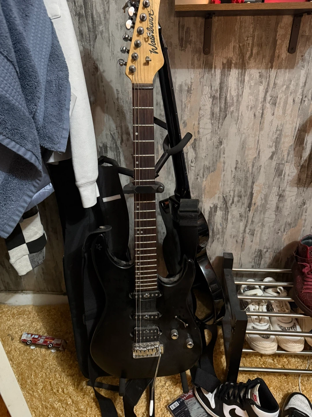 Selling a Washburn electric guitar in black. It's in okay condition and ready to be used. Plays well with some minors issues that don’t effect playing