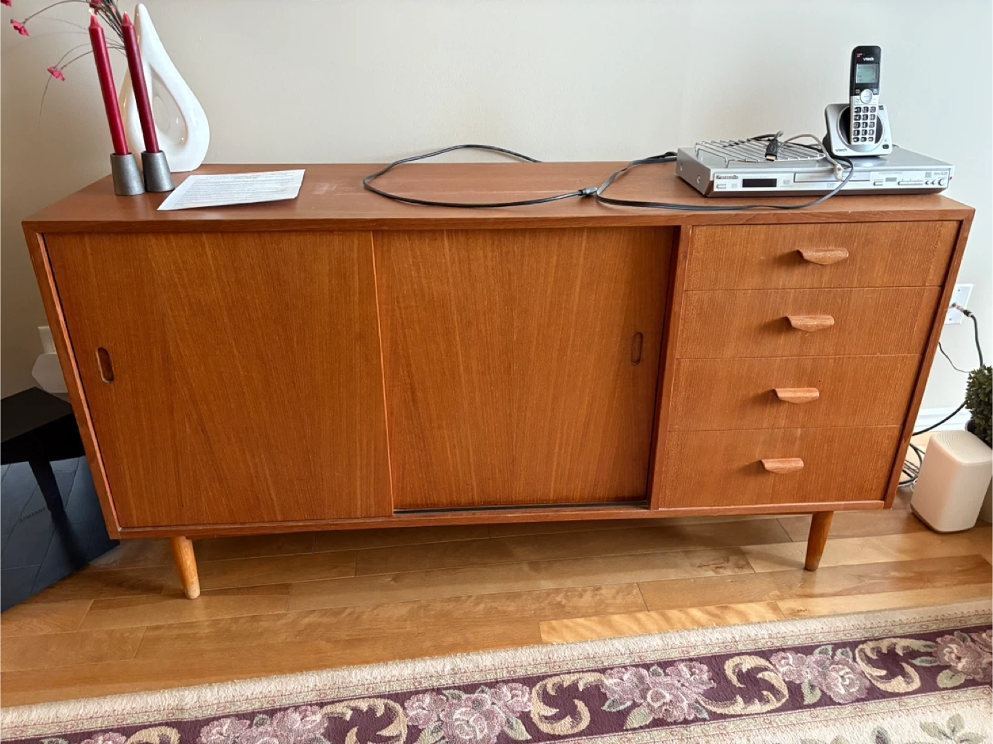 Offering a vintage 60s original family owned Teak wooden credenza sideboard. It features sliding doors and drawers for many storage options. Warm deep teak colour.