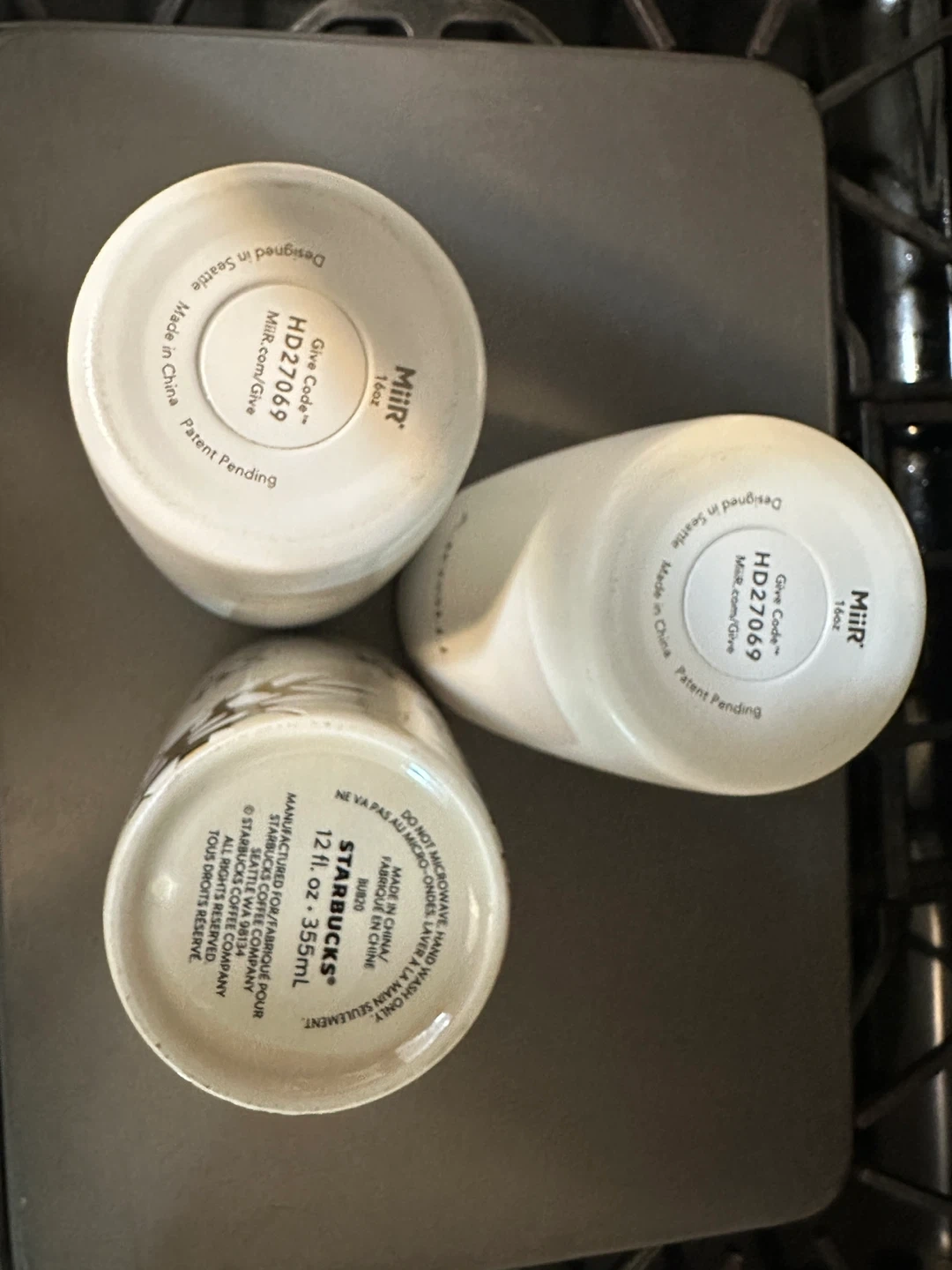 Selling 2 MiiR 16oz tumbler and a Starbucks 12oz tumbler. All are in great condition and ready for your favorite beverages. The MiiR tumblers are designed in Seattle and made in China. The Starbucks tumbler is also made in China and holds 12 fl oz or 355 mL
