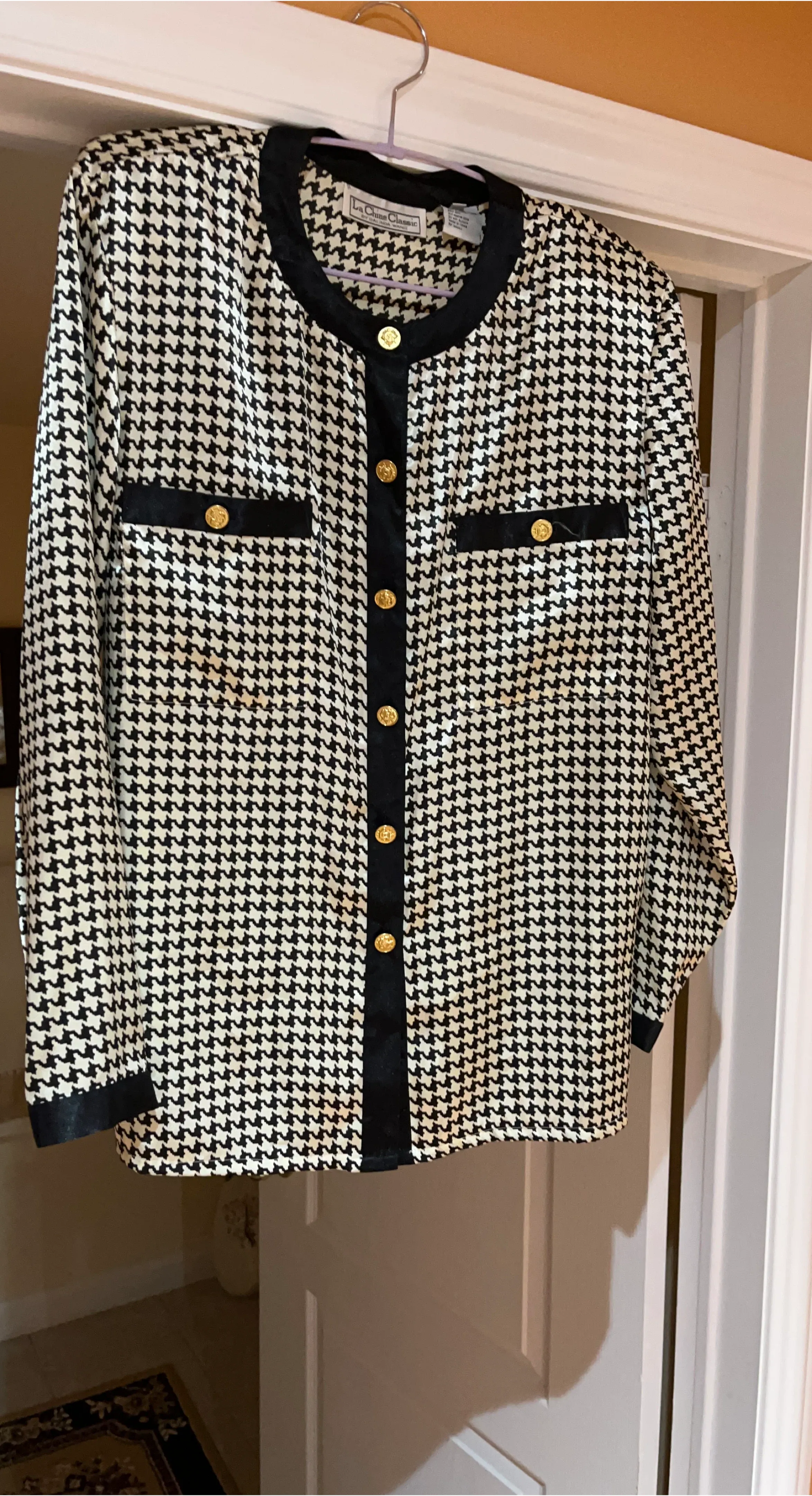 Selling a La Chine Classic blouse with a black and white houndstooth pattern. It features black trim and gold buttone.