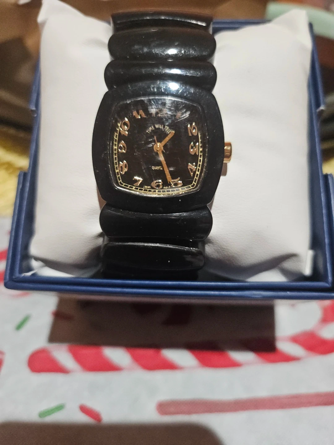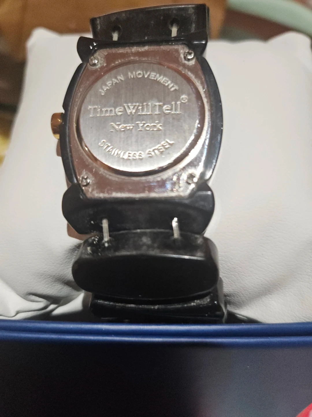 Selling a Time Will Tell quartz watch. It has a black design with a square face. The back says 'Japan Movement' and 'Stainless Steel'.