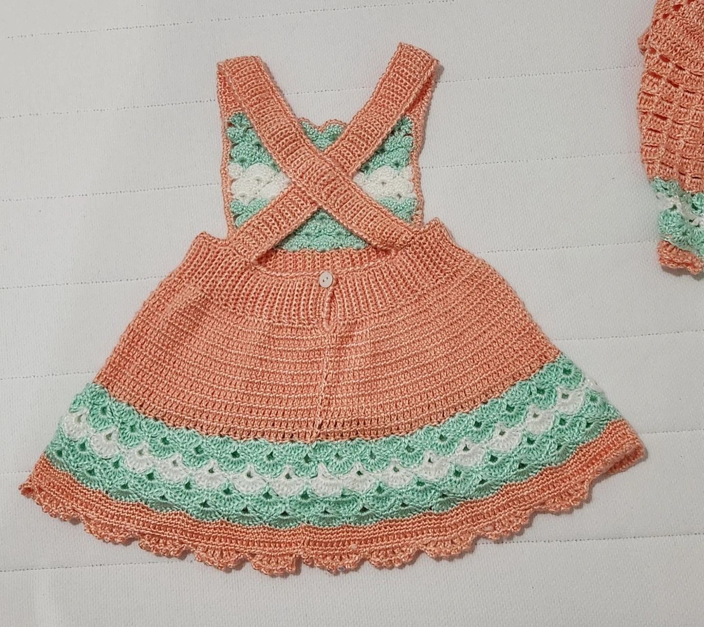 This adorable handmade crochet baby dress and cardigan set is perfect for your little one. The set features a lovely peach colour with mint and white accents. It's carefully crafted with a beautiful crochet pattern. A sweet addition to any baby's wardrobe!
