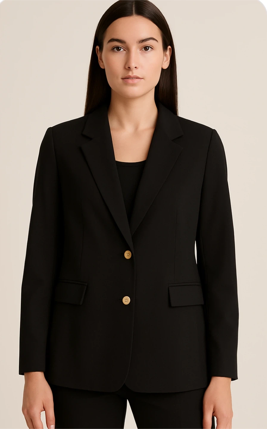 A stylish black blazer from Haver & Blair. It's a classic piece that can be dressed up or down. The blazer features gold buttons on the sleeves and front. Perfect for adding a touch of sophistication to any outfit