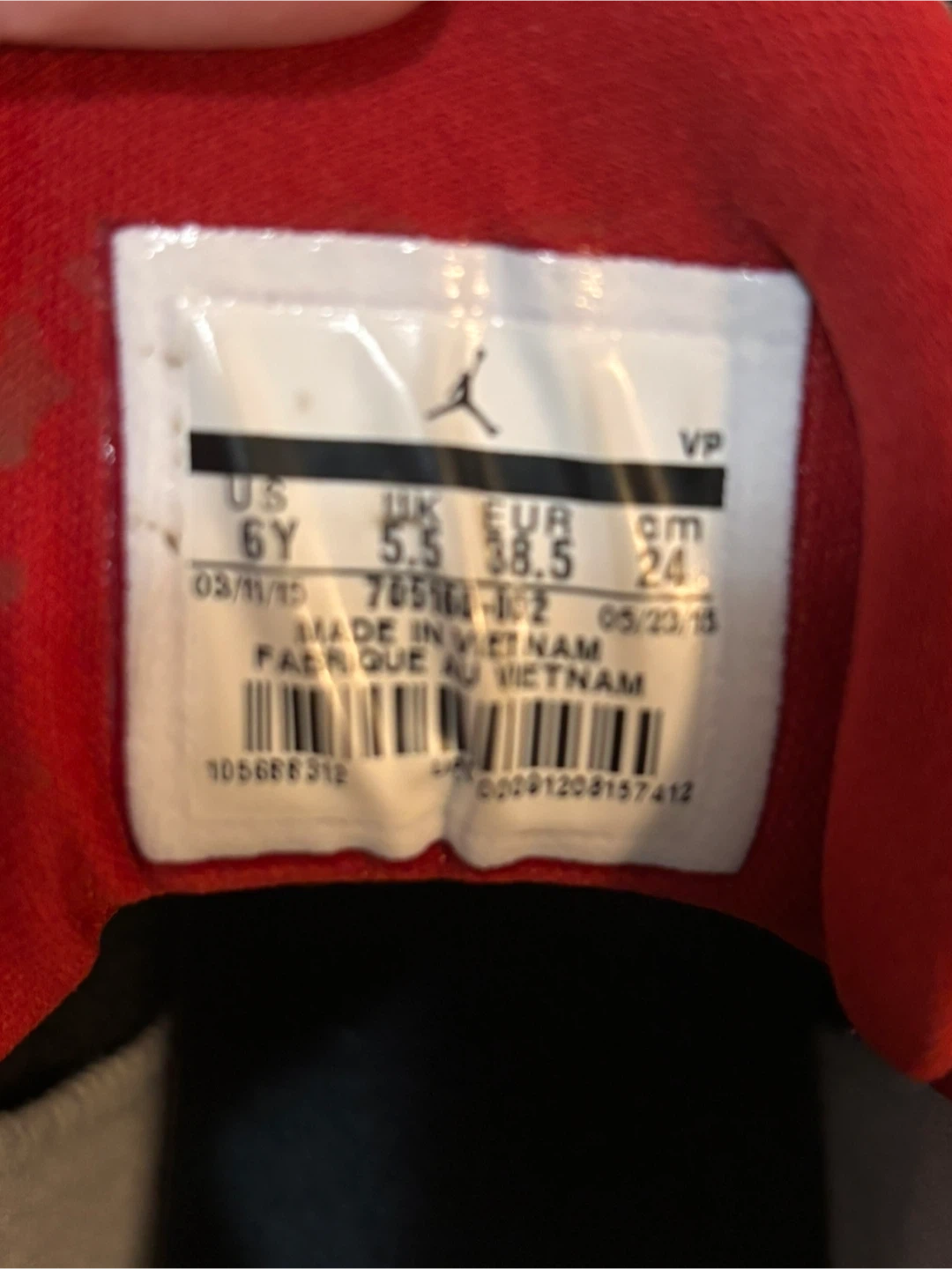 Selling a pair of Jordan Flight 45 High sneakers in youth size US 6Y. They feature a black and red colour scheme. They are high tops. Used - some marks on them but just need a good clean