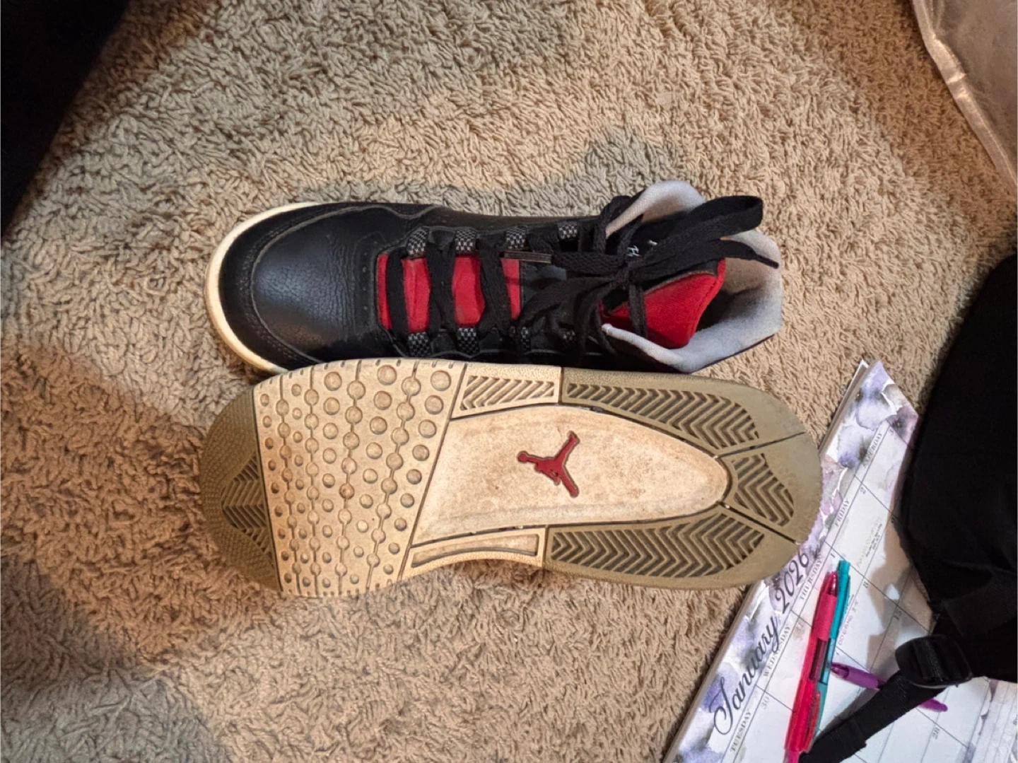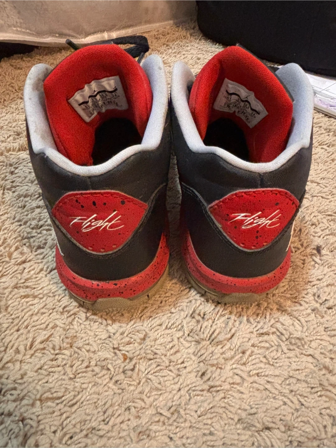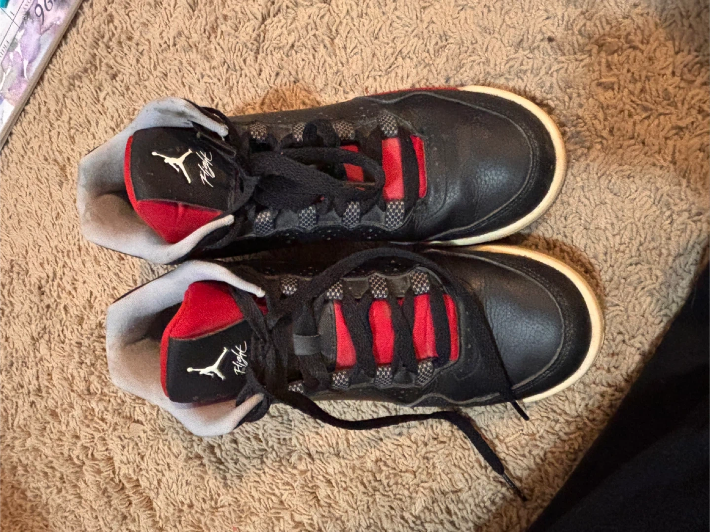 Selling a pair of Jordan Flight 45 High sneakers in youth size US 6Y. They feature a black and red colour scheme. They are high tops. Used - some marks on them but just need a good clean