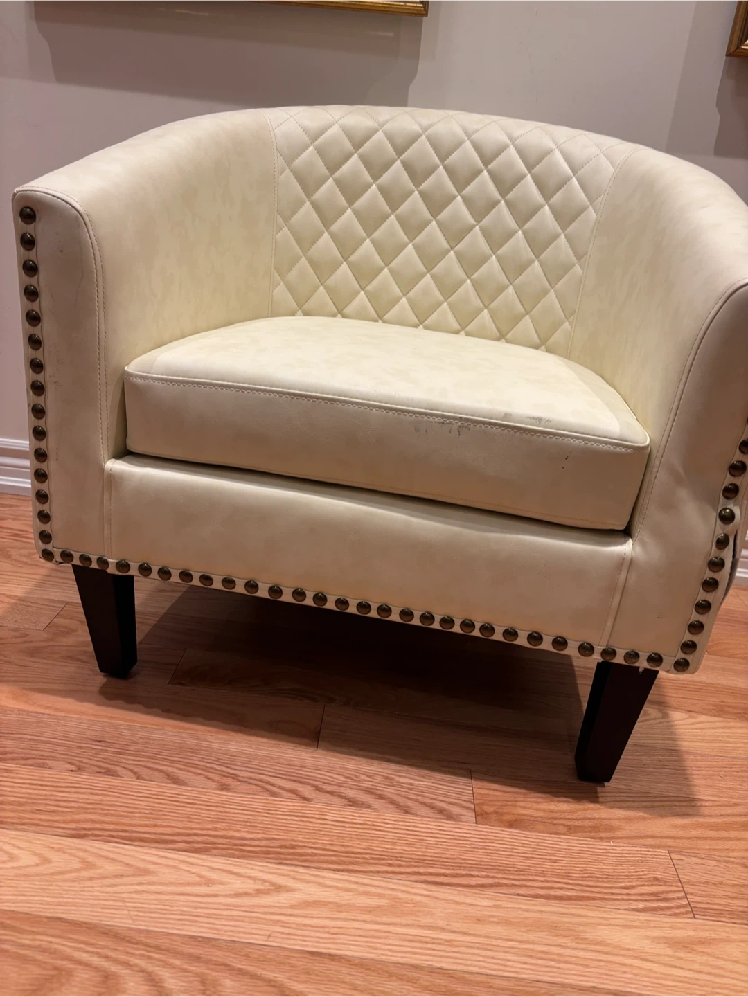 Selling a cream-coloured barrel chair. It features a quilted back and nailhead trim, adding a touch of elegance to any room. There's a small tear on the side, as shown in the photos.item was purchased AS IS from Auction. Available for pickup and delivery