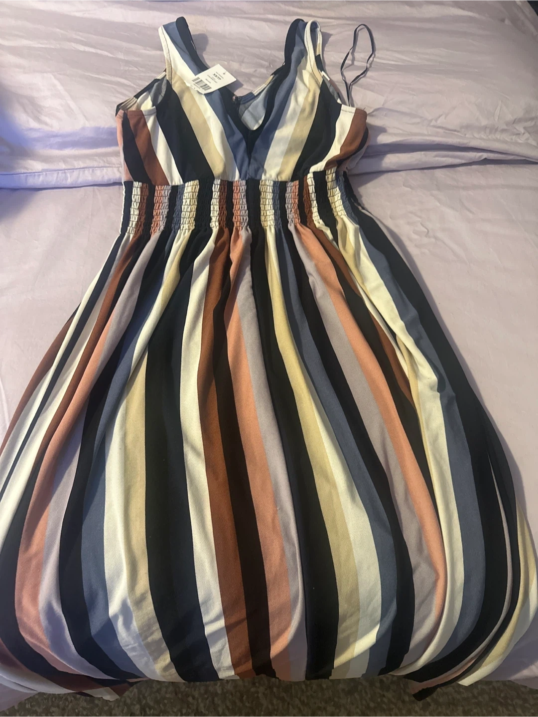 Here's a cute striped sundress that's perfect for summer! It's a size medium and features a flattering V-neck design. The dress has a comfortable elastic waistband and flowy skirt. Great for a casual day out or a summer evening gathering