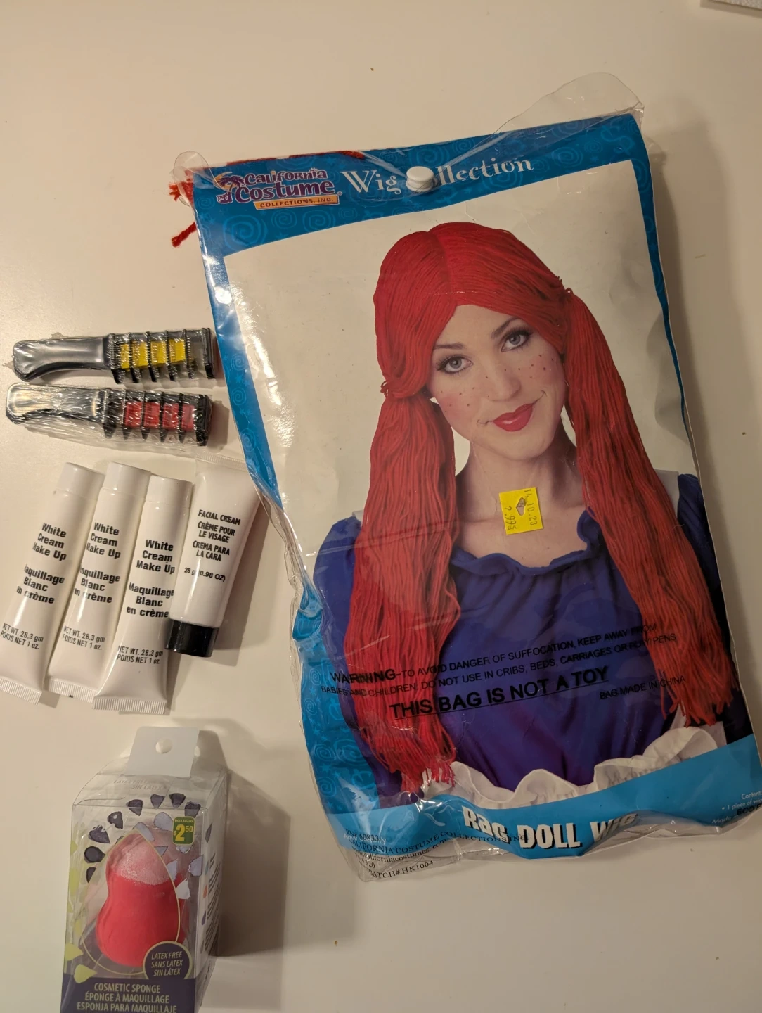 Get ready for Halloween or a costume party with this Rag Doll wig and makeup kit! It includes: - Rag Doll Wig - White Cream Make Up (4 tubes) - Cosmetic Sponge (latex-free) - Hair color applicators