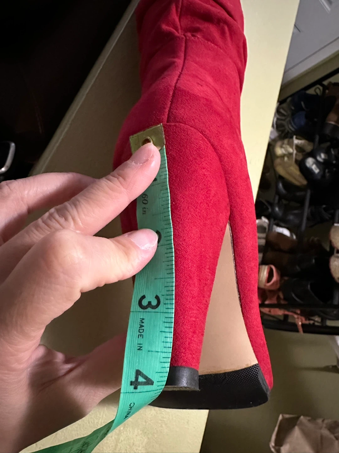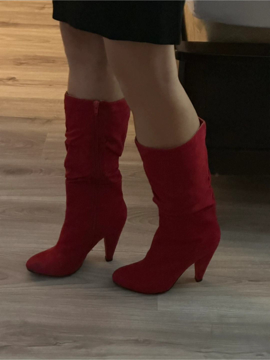 Selling a pair of red suede heeled boots. They are a US size 6.5. Heels are 4” high. They are new, but there is a stain at the tip of left show. However it’s not very noticeable