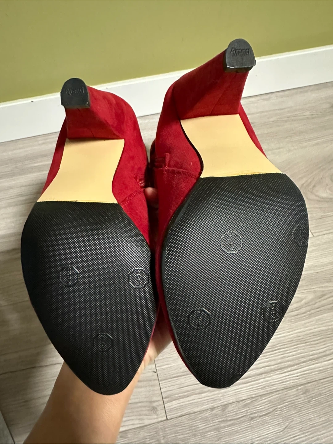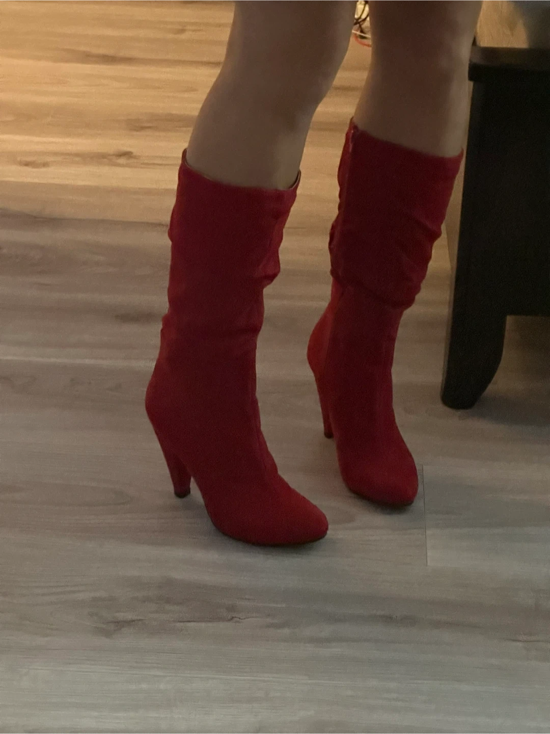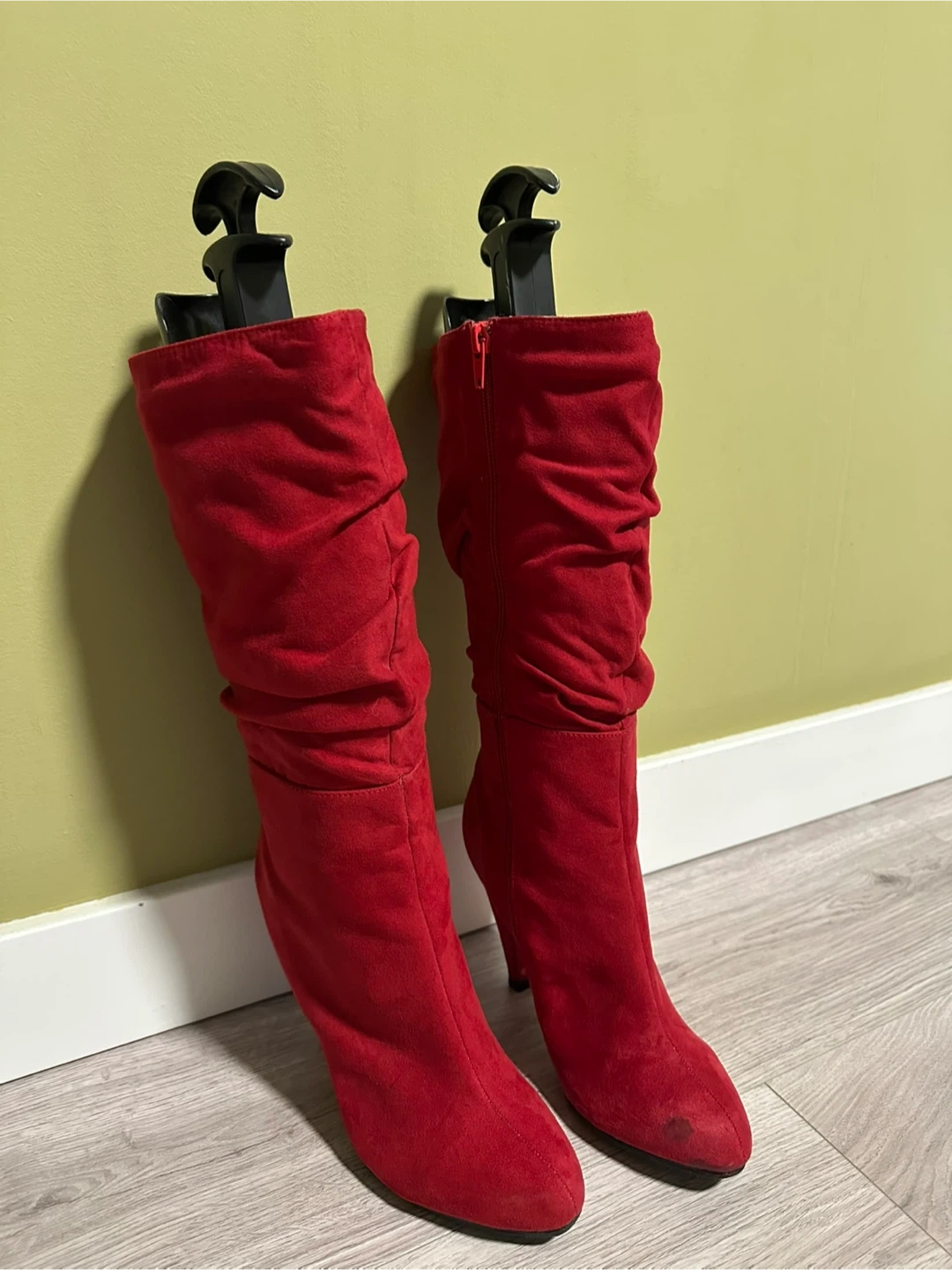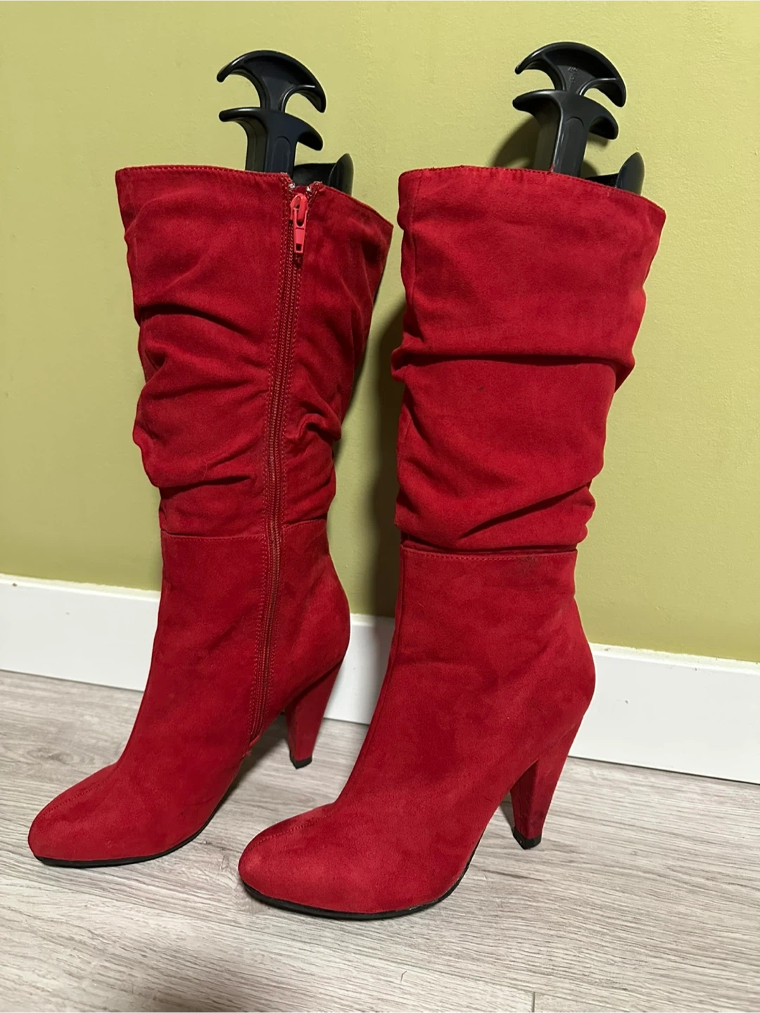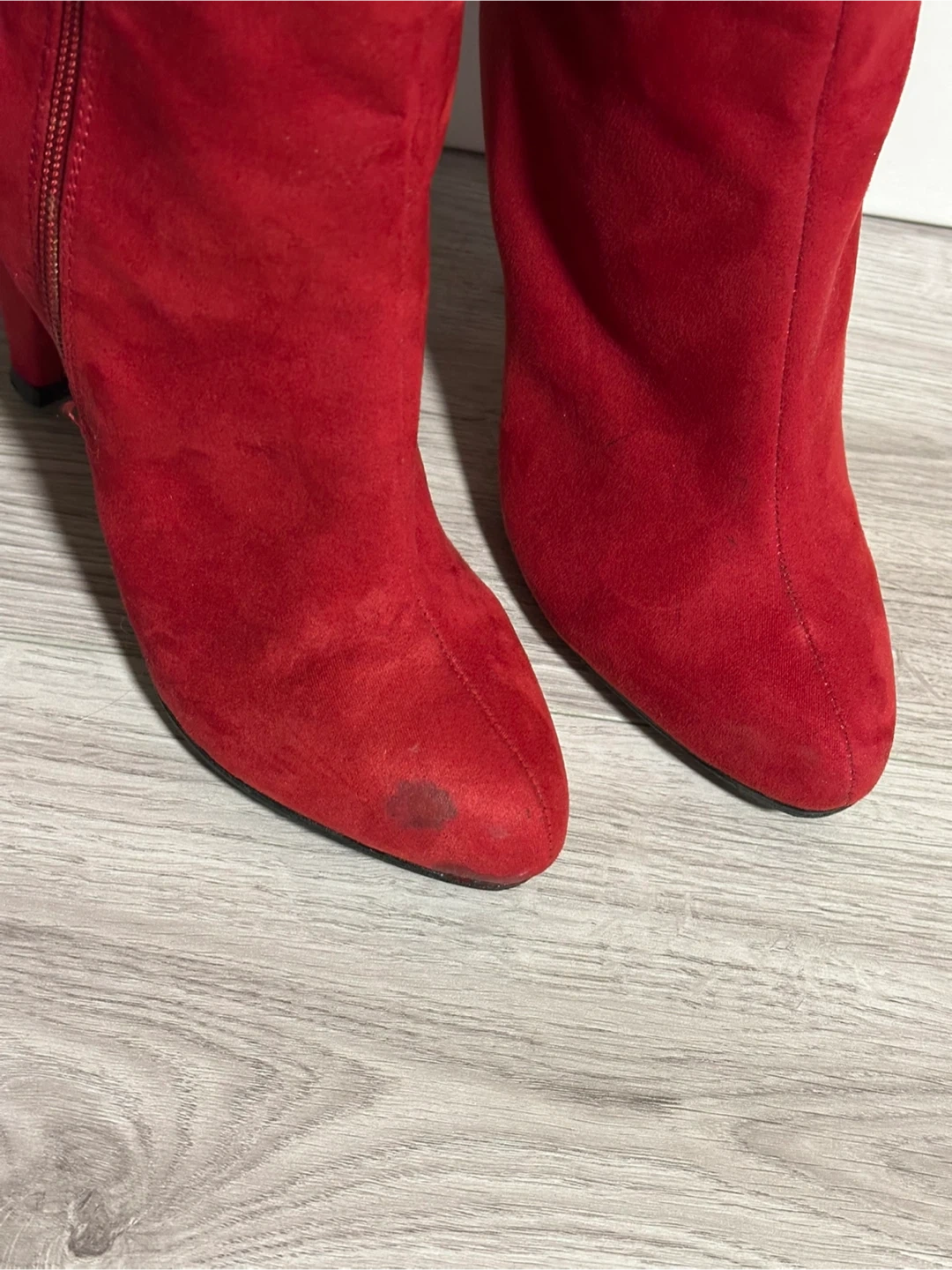 Selling a pair of red suede heeled boots. They are a US size 6.5. Heels are 4” high. They are new, but there is a stain at the tip of left show. However it’s not very noticeable