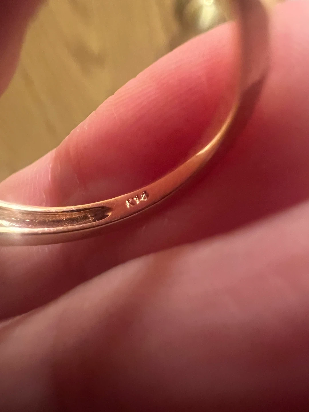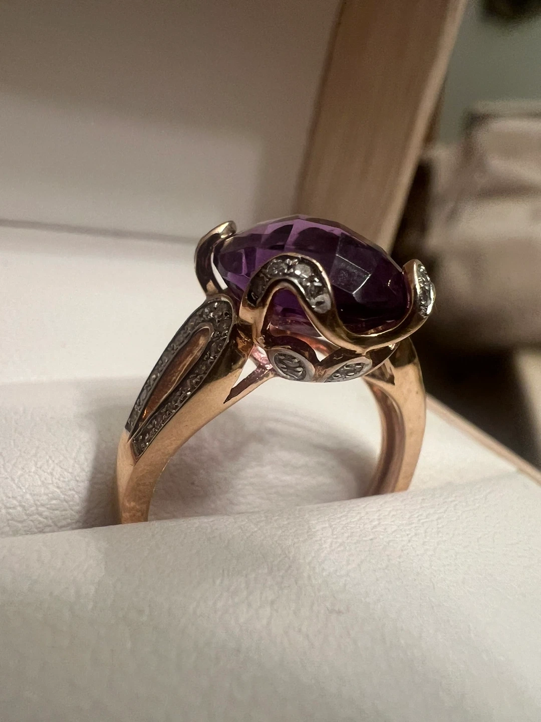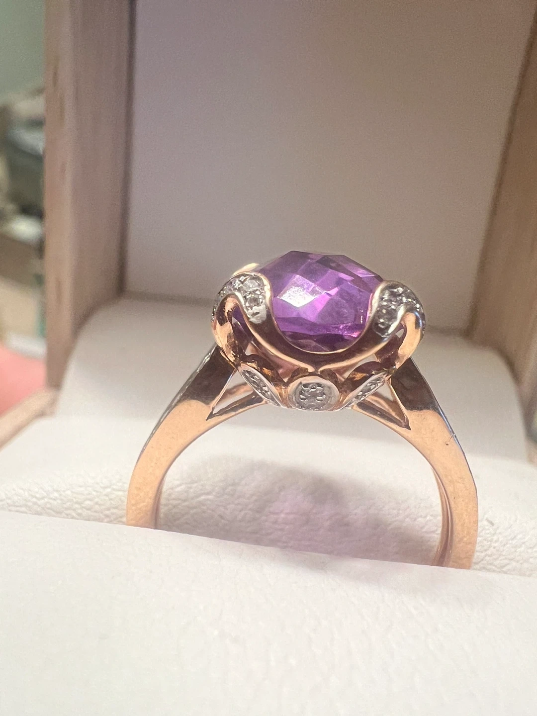 Beautiful 14 k amethyst ring with diamond accents set in a rose gold tone. It's in excellent condition and ready to wear!