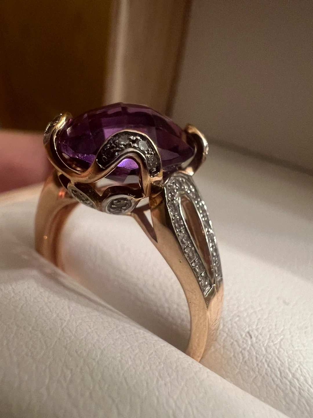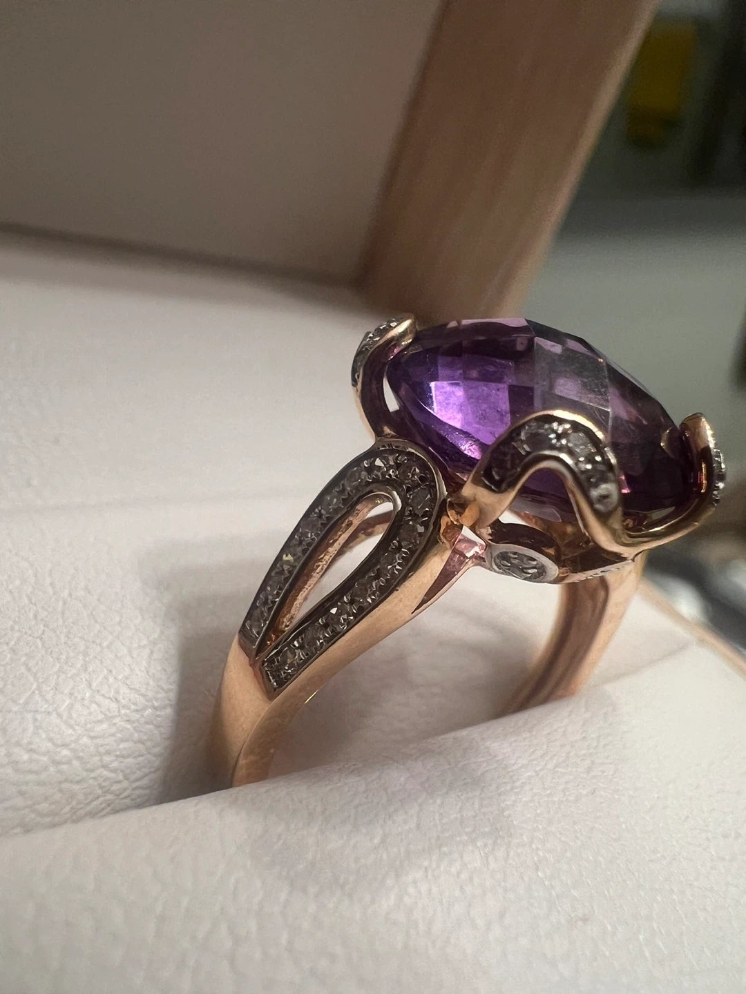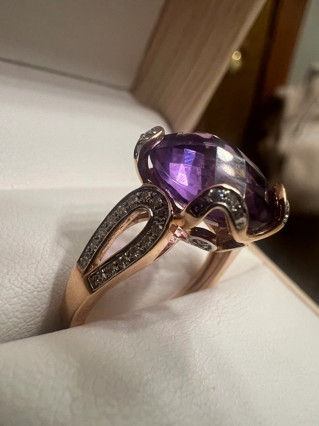 Beautiful 14 k amethyst ring with diamond accents set in a rose gold tone. It's in excellent condition and ready to wear!