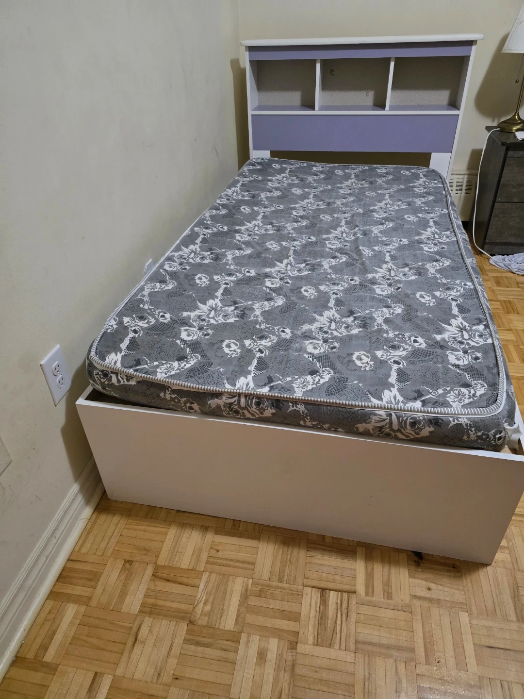 Selling a twin bed frame that has built-in storage drawers! It's in good condition and perfect for a kid's room or a smaller space where you need some extra storage. The headboard also has shelves for books or decorations