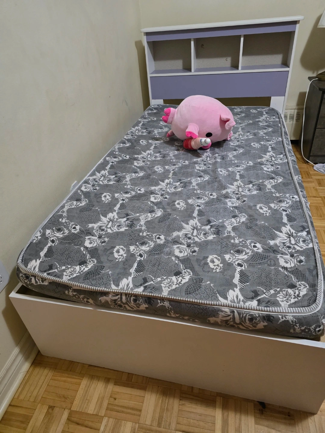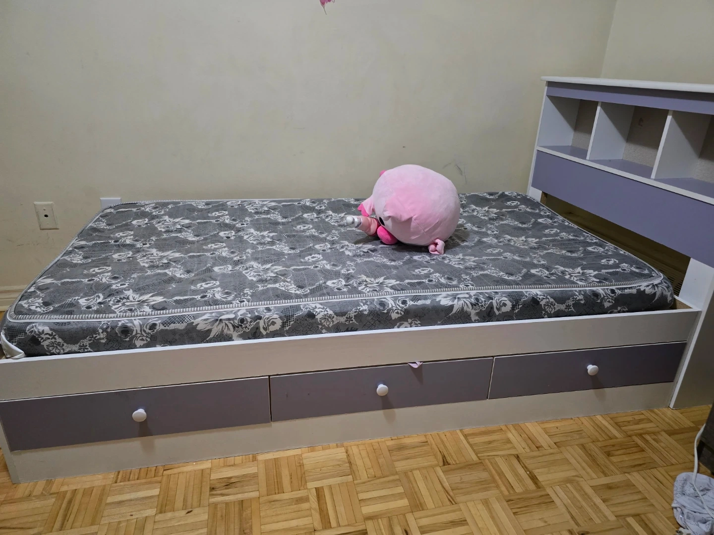 Selling a twin bed frame that has built-in storage drawers! It's in good condition and perfect for a kid's room or a smaller space where you need some extra storage. The headboard also has shelves for books or decorations