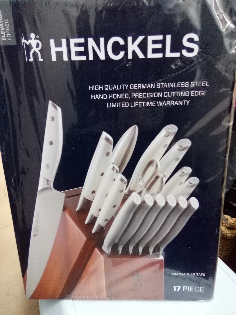 Selling a brand new Henckels 17-piece knife block set! It's still in its original packaging. High-quality German stainless steel set features hand-honed blades for a precision cutting edge and comes with a limited lifetime warranty. Dishwasher safe for easy cleaning. Originally bought at Home sense for $249.99! Unopened