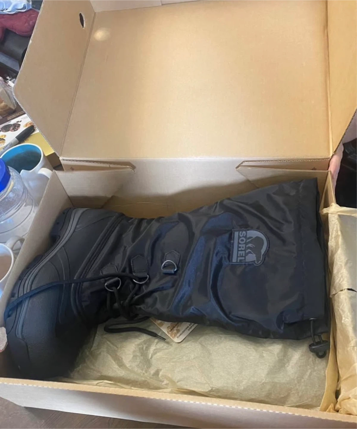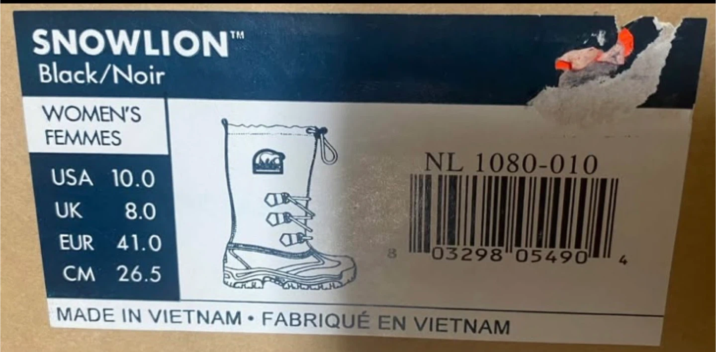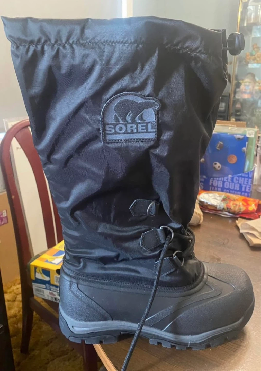 Selling a pair of brand new Sorel Snowlion winter boots in black, women's size 10. These boots are perfect for keeping your feet warm and dry during the winter months. They come in the original box!