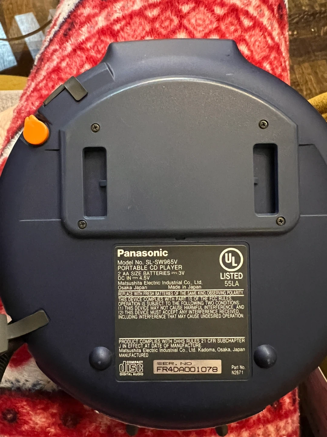 Selling a Panasonic SL-SW965V portable CD player. It comes with a Case Logic bag for easy carrying. It's in used condition, but still works. Great for listening to your CDs on the go!